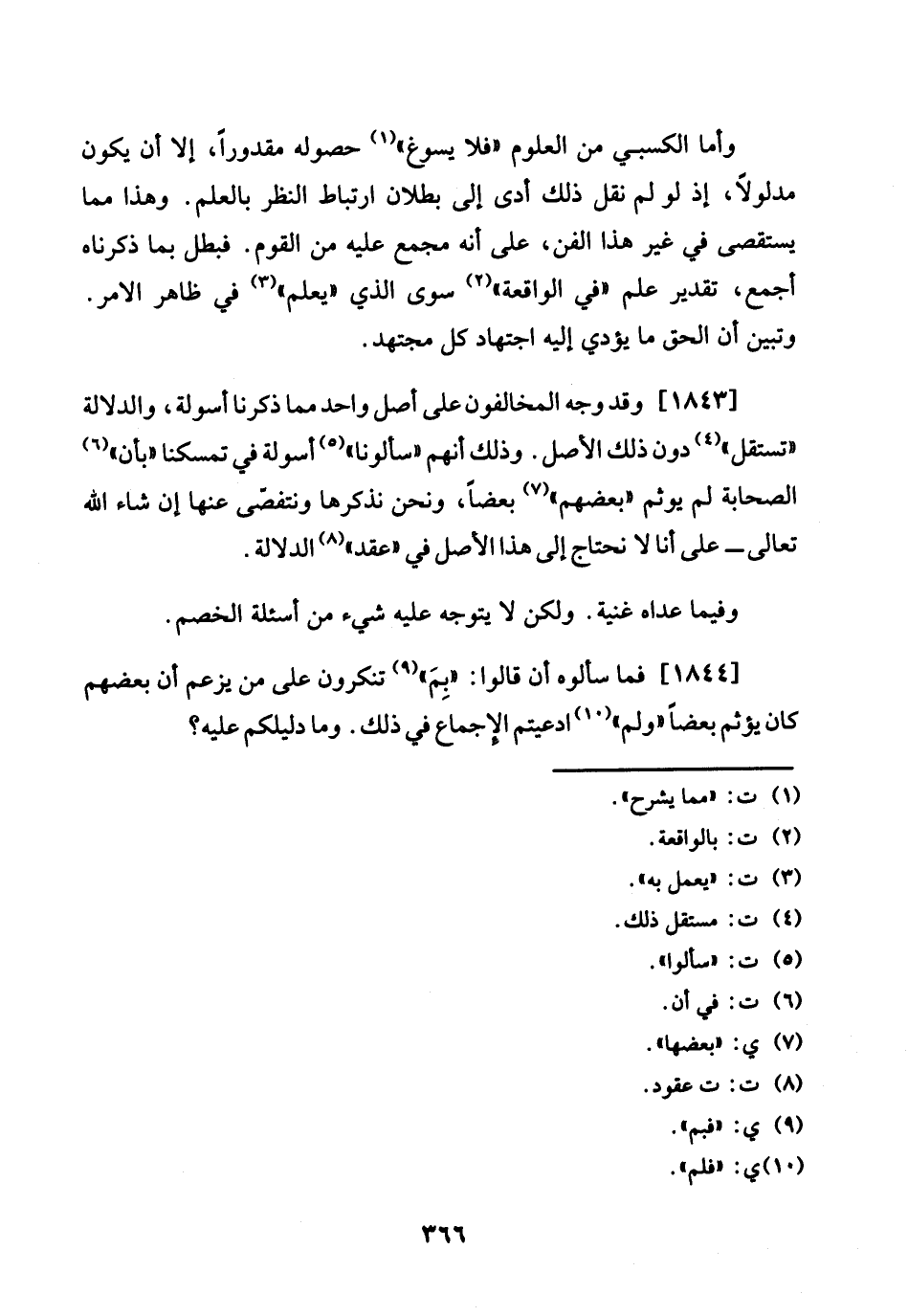وَأما الكسبي من الْعُلُوم " فَلَا يسوغ " حُصُوله مَقْدُورًا، إِلَّا أَن يكون مدلولا، إِذْ لَو لم نقل ذَلِك أدّى إِلَى بطلَان ارتباط النّظر بِالْعلمِ. وَهَذَا مِمَّا يستقصى فِي غير هَذَا الْفَنّ، على أَنه مجمع عَلَيْهِ من الْقَوْم. فَبَطل بِمَا ذَكرْنَاهُ أجمع، تَقْدِير علم " فِي الْوَاقِعَة " سوى الَّذِي " يعلم " فِي ظَاهر الامر. وَتبين أَن الْحق مَا يُؤَدِّي إِلَيْهِ اجْتِهَاد كل مُجْتَهد.
