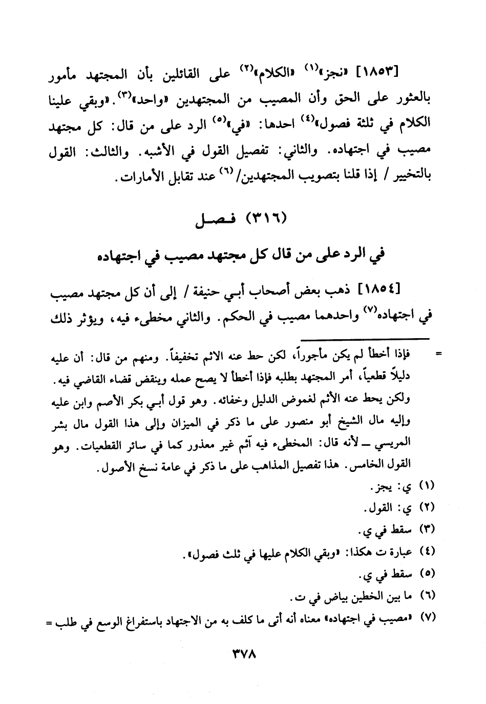 1853 - " نجز " " الْكَلَام " على الْقَائِلين بِأَن الْمُجْتَهد مَأْمُور بالعثور على الْحق وَأَن الْمُصِيب من الْمُجْتَهدين " وَاحِد ". " وَبَقِي علينا الْكَلَام فِي ثَلَاثَة فُصُول " احدها: " فِي " الرَّد على من قَالَ: كل مُجْتَهد مُصِيب فِي اجْتِهَاده. وَالثَّانِي: تَفْصِيل القَوْل فِي الْأَشْبَه. وَالثَّالِث: القَوْل بالتخيير / إِذا قُلْنَا بتصويب الْمُجْتَهدين / عِنْد تقَابل الأمارات.