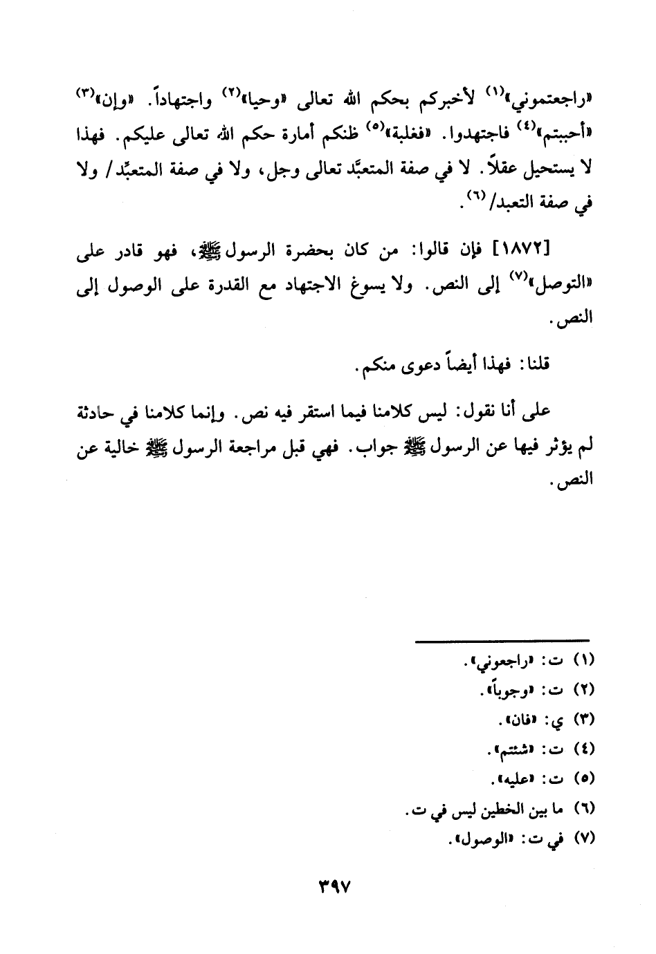 1872 - فَإِن قَالُوا: من كَانَ بِحَضْرَة الرَّسُول، فَهُوَ قَادر على " التَّوَصُّل " إِلَى النَّص. وَلَا يسوغ الِاجْتِهَاد مَعَ الْقُدْرَة على الْوُصُول إِلَى النَّص.