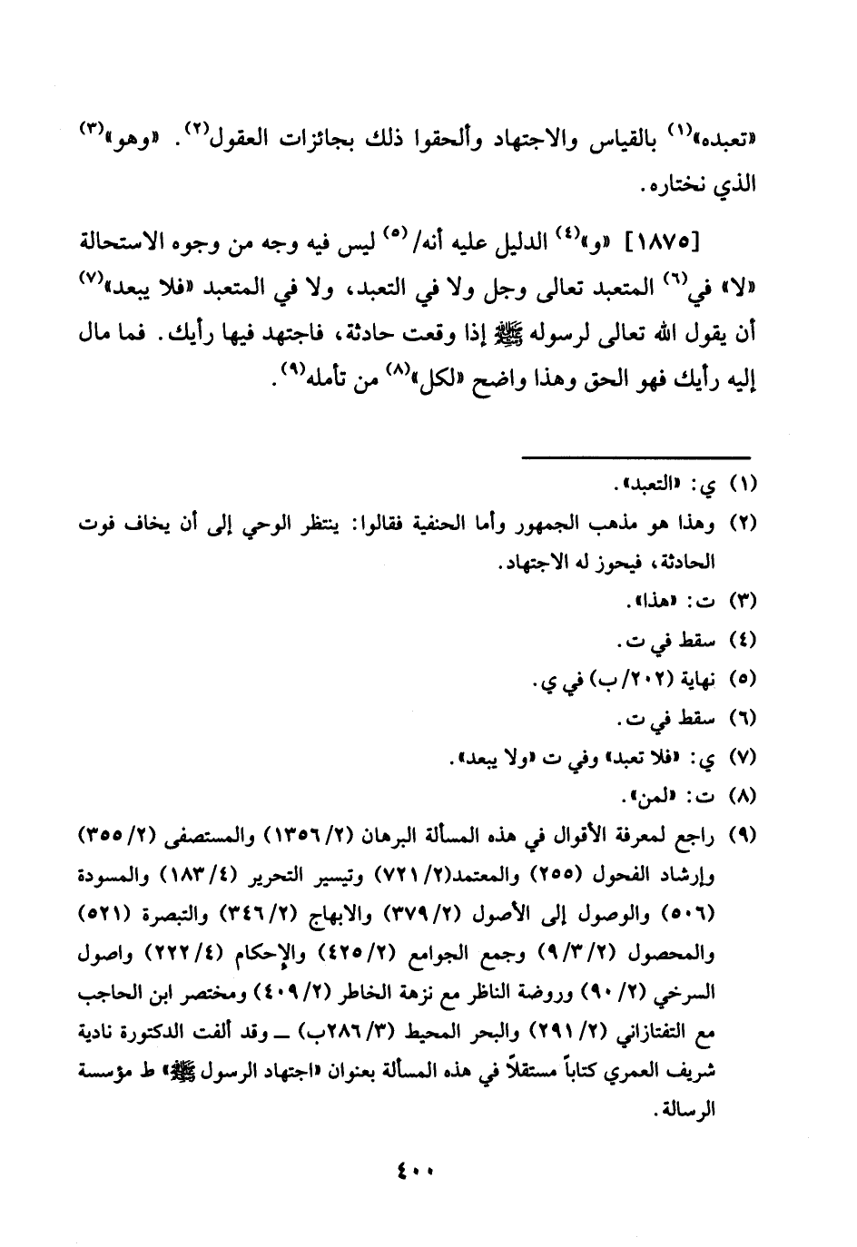 1875 - " و " الدَّلِيل عَلَيْهِ أَنه / لَيْسَ فِيهِ وَجه من وُجُوه الاستحالة " لَا " فِي المتعبد تَعَالَى وَجل وَلَا فِي التَّعَبُّد، وَلَا فِي المتعبد " فَلَا يبعد " أَن يَقُول الله تَعَالَى لرَسُول [صلى الله عَلَيْهِ وَسلم] إِذا وَقعت حَادِثَة، فاجتهد فِيهَا رَأْيك. فَمَا مَال إِلَيْهِ رَأْيك فَهُوَ الْحق وَهَذَا وَاضح " لكل " من تَأمله.