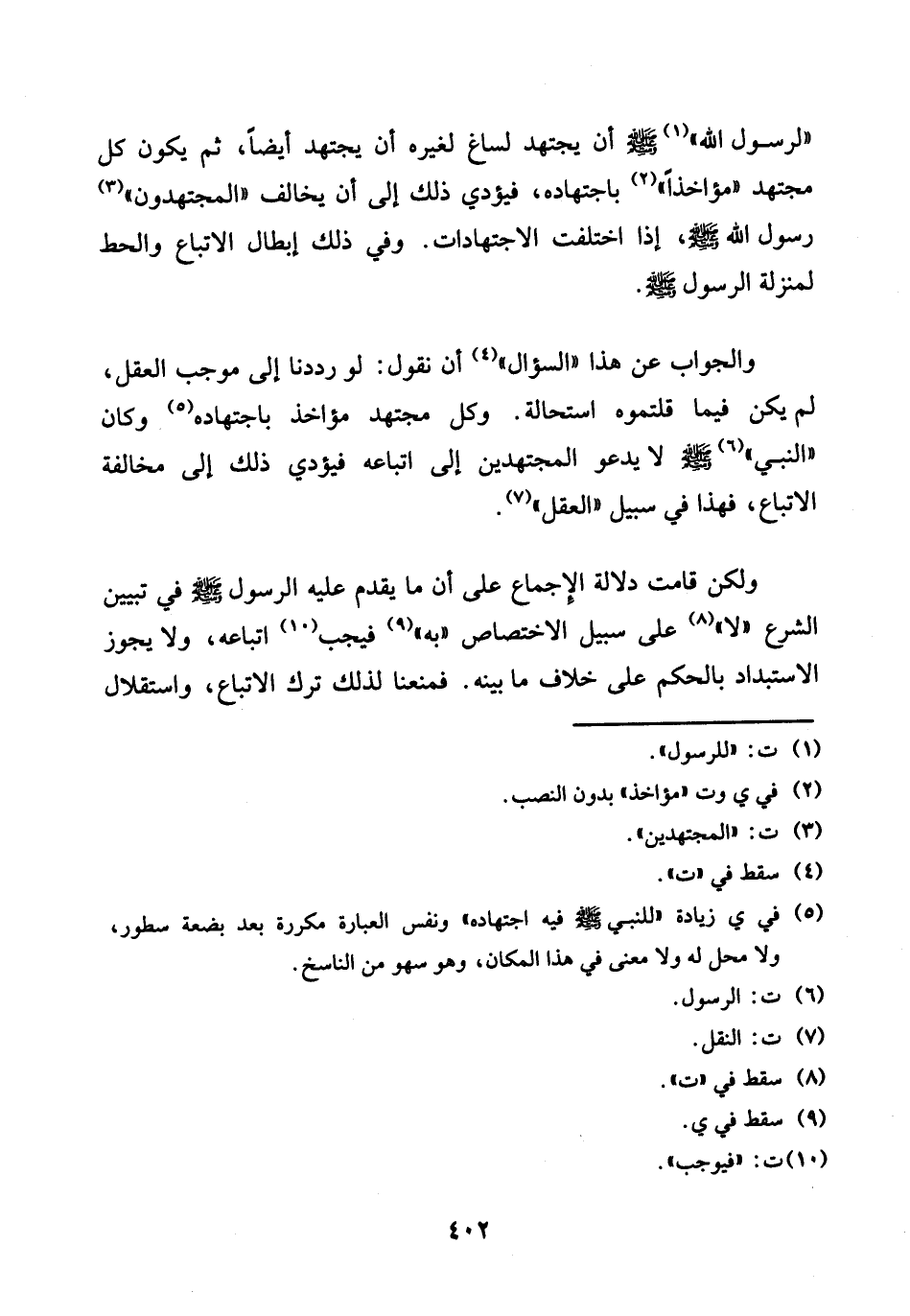 " لرَسُول الله " [صلى الله عَلَيْهِ وَسلم] أَن يجْتَهد لساغ لغيره أَن يجْتَهد أَيْضا، ثمَّ يكون كل مُجْتَهد " مؤاخذا " بِاجْتِهَادِهِ، فَيُؤَدِّي ذَلِك إِلَى أَن يُخَالف " المجتهدون " رَسُول الله [صلى الله عَلَيْهِ وَسلم] ، إِذا اخْتلفت الاجتهادات. وَفِي ذَلِك إبِْطَال الِاتِّبَاع والحط لمنزلة الرَّسُول [صلى الله عَلَيْهِ وَسلم] .