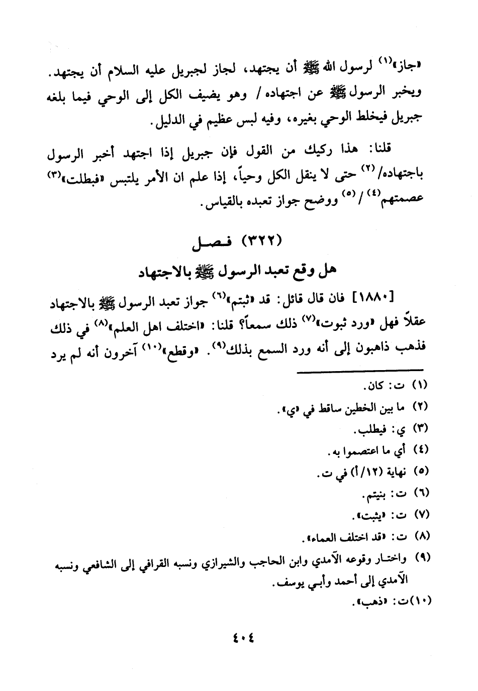 1880 - فان قَالَ قَائِل: قد " ثبتمْ " جَوَاز تعبد الرَّسُول [صلى الله عَلَيْهِ وَسلم] بِالِاجْتِهَادِ عقلا فَهَل " ورد ثُبُوت " ذَلِك سمعا؟ قُلْنَا: " اخْتلف اهل الْعلم " فِي ذَلِك فَذهب ذاهبون إِلَى أَنه ورد السّمع بذلك. وَقطع آخَرُونَ أَنه لم يرد