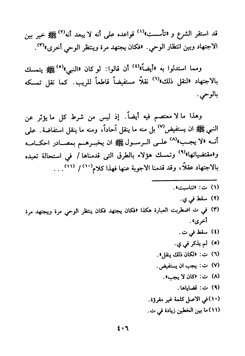 وَهَذَا مَا لَا معتصم فِيهِ أَيْضا. إِذْ لَيْسَ من شَرط كل مَا يُؤثر عَن النَّبِي [صلى الله عَلَيْهِ وَسلم] ان يستفيض بل مِنْهُ مَا ينْقل آحادا، وَمِنْه مَا ينْقل استفاضة. على أَنه " لَا يجب " على الرَّسُول [صلى الله عَلَيْهِ وَسلم] أَن يُخْبِرهُمْ بمصادر احكامه و " مقتضياتها " وَتمسك هَؤُلَاءِ بالطرق الَّتِي قدمناها / فِي اسْتِحَالَة تعبده بِالِاجْتِهَادِ عقلا، وَقد قدمنَا الاجوبة عَنْهَا فَهَذَا كَلَام