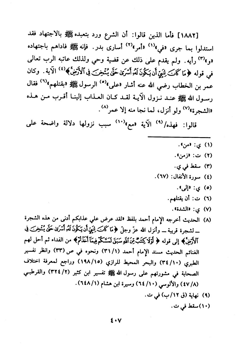 1882 - فَأَما الَّذين قَالُوا: أَن الشَّرْع ورد بتعبده [صلى الله عَلَيْهِ وَسلم] بِالِاجْتِهَادِ فقد استدلوا بِمَا جرى " فِي " أَمر أُسَارَى بدر. فَإِنَّهُ [صلى الله عَلَيْهِ وَسلم] فادهم بِاجْتِهَادِهِ " و " رَأْيه. وَلم يقدم على ذَلِك عَن قَضِيَّة وَحي وَلذَلِك عاتبه الرب تَعَالَى فِي قَوْله {مَا كَانَ لنَبِيّ أَن يكون لَهُ أسرى حَتَّى يثخن فِي الأَرْض} الْآيَة. وَكَانَ عمر بن الْخطاب رَضِي الله عَنهُ أَشَارَ " على " الرَّسُول [صلى الله عَلَيْهِ وَسلم] " بِقَتْلِهِم " فَقَالَ رَسُول الله [صلى الله عَلَيْهِ وَسلم] عِنْد نزُول الْآيَة لقد كَانَ الْعَذَاب إِلَيْنَا أقرب من هَذِه " الشَّجَرَة " وَلَو أنزل، لما نجا مِنْهُ إِلَّا عمر.