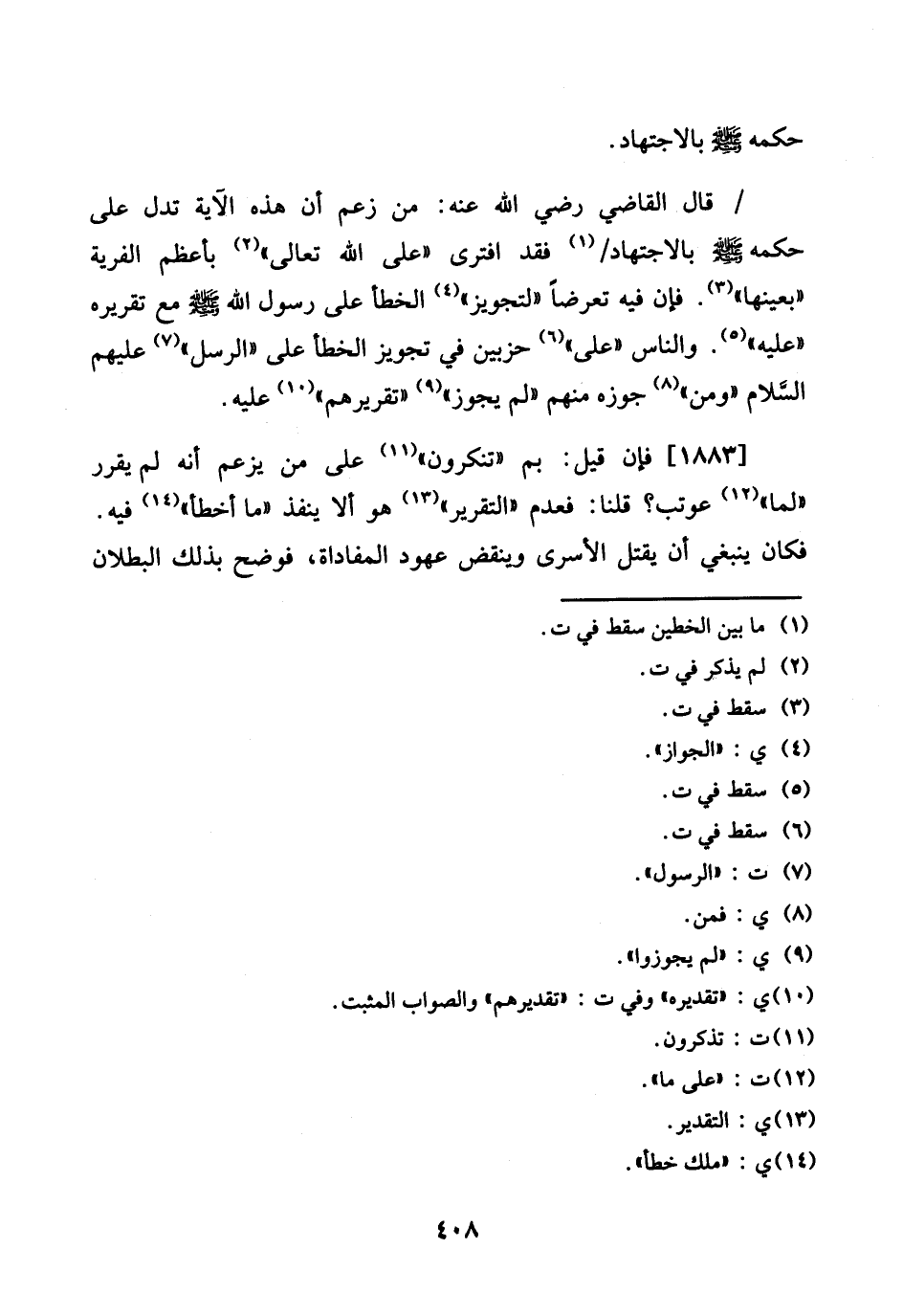 1883 - فَإِن قيل: بِمَ تنكرون على من يزْعم أَنه لم يُقرر " لما " عوتب؟ قُلْنَا: فَعدم " التَّقْرِير " هُوَ أَلا ينفذ " مَا أَخطَأ " فِيهِ. فَكَانَ يَنْبَغِي أَن يقتل الأسرى وينقض عهود المفاداة، فوضح بذلك الْبطلَان