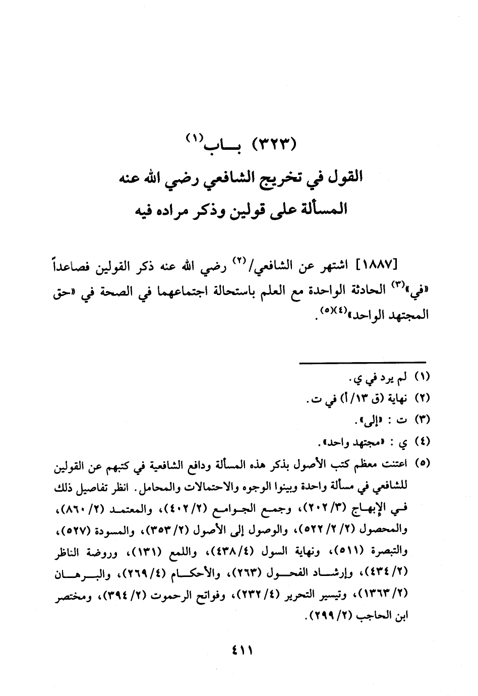 1887 - اشْتهر عَن الشَّافِعِي / رَضِي الله عَنهُ ذكر الْقَوْلَيْنِ فَصَاعِدا " فِي " الْحَادِثَة الْوَاحِدَة مَعَ الْعلم باستحالة اجْتِمَاعهمَا فِي الصِّحَّة فِي " حق الْمُجْتَهد الْوَاحِد ".