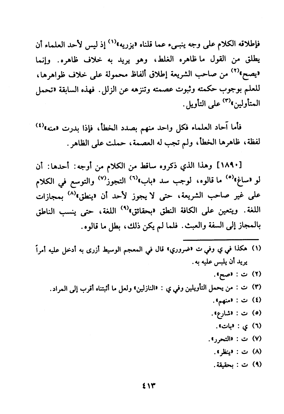فإطلاقة الْكَلَام على وَجه يُنبئ عَمَّا قُلْنَاهُ " يزريه " إِذْ لَيْسَ لأحد الْعلمَاء أَن يُطلق من القَوْل مَا ظَاهره الْغَلَط، وَهُوَ يُرِيد بِهِ خلاف ظَاهره. وَإِنَّمَا " يَصح " من صَاحب الشَّرِيعَة إِطْلَاق أَلْفَاظ مَحْمُولَة على خلاف ظواهرها، للْعلم بِوُجُوب حكمته وَثُبُوت عصمته وتنزهه عَن الزلل. فَهَذِهِ السَّابِقَة " تحمل المتأولين " على التَّأْوِيل.