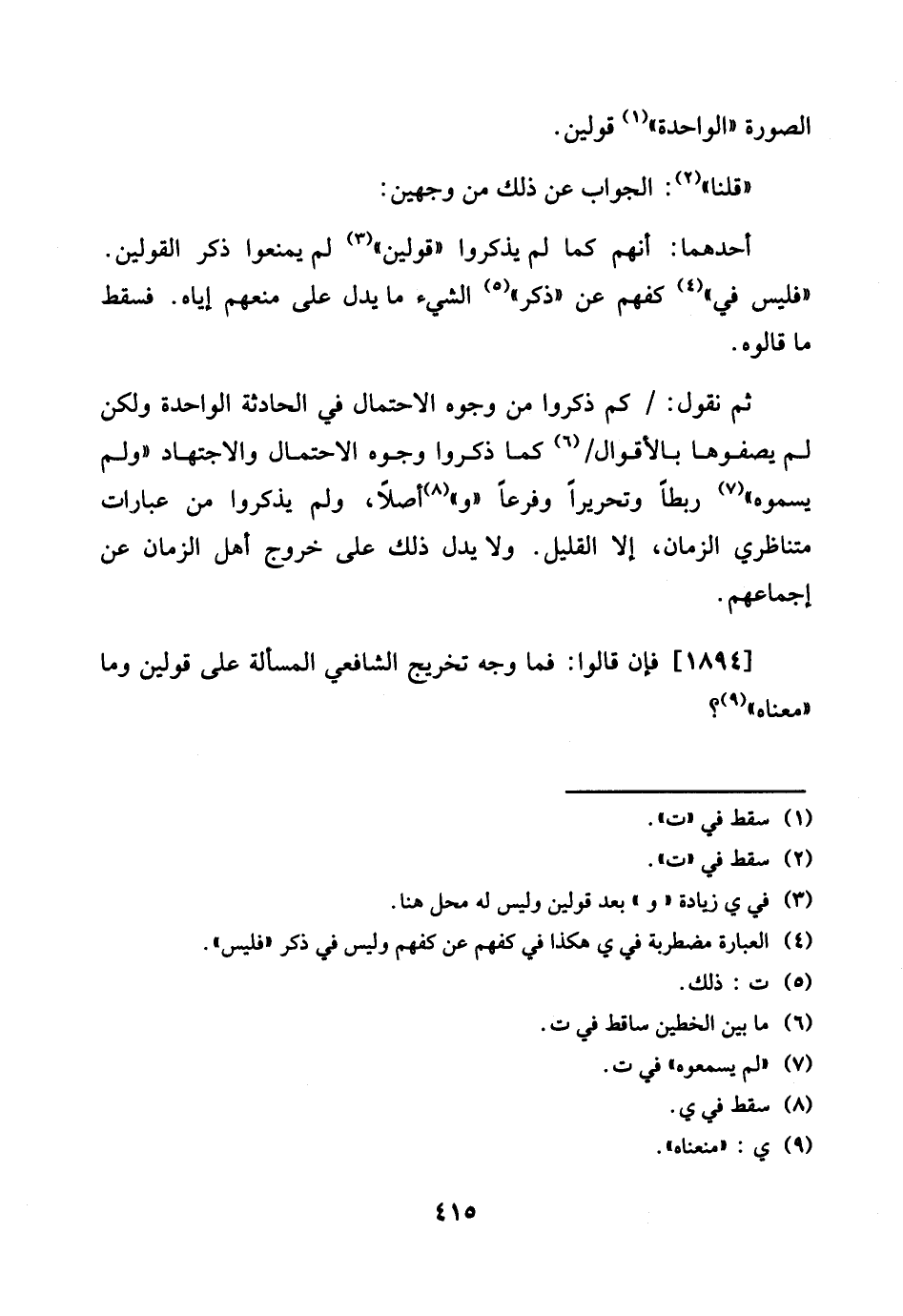 ثمَّ نقُول: / كم ذكرُوا من وُجُوه الِاحْتِمَال فِي الْحَادِثَة الْوَاحِدَة وَلَكِن لم يصفوها بالأقوال / كَمَا ذكرُوا وُجُوه الِاحْتِمَال وَالِاجْتِهَاد " وَلم يسموه " ربطا وتحريرا وفرعا " و " أصلا، وَلم يذكرُوا من عِبَارَات متناظري الزَّمَان، إِلَّا الْقَلِيل. وَلَا يدل ذَلِك على خُرُوج أهل الزَّمَان عَن إِجْمَاعهم.