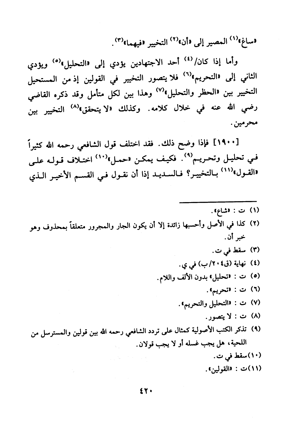 1900 - فَإذْ وضح ذَلِك. فقد اخْتلف قَول الشَّافِعِي رَحمَه الله كثيرا فِي تَحْلِيل وَتَحْرِيم. فَكيف يُمكن " حمل " اخْتِلَاف قَوْله على " القَوْل " بالتخيير؟ فالسديد إِذا أَن نقُول فِي الْقسم الْأَخير الَّذِي