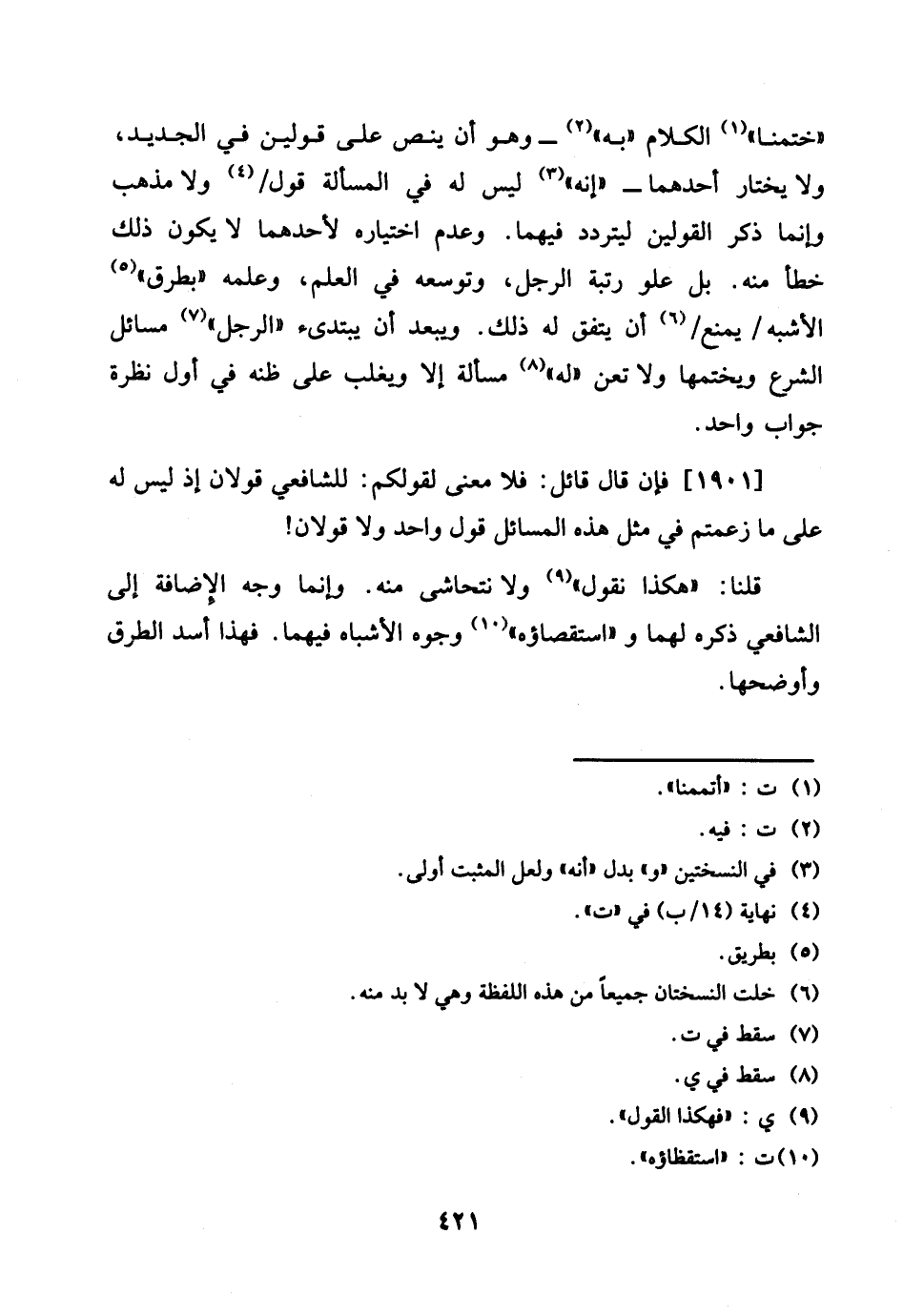 " ختمنا " الْكَلَام " بِهِ " - وَهُوَ أَن ينص على قَوْلَيْنِ فِي الْجَدِيد، وَلَا يخْتَار أَحدهمَا - " إِنَّه " لَيْسَ لَهُ فِي الْمَسْأَلَة قَول / وَلَا مَذْهَب وَإِنَّمَا ذكر الْقَوْلَيْنِ ليتردد فيهمَا. وَعدم اخْتِيَاره لأَحَدهمَا لَا يكون ذَلِك خطأ مِنْهُ. بل علو رُتْبَة الرجل، وتوسعه فِي الْعلم، وَعلمه " بطرق " الْأَشْبَه / يمْنَع / أَن يتَّفق لَهُ ذَلِك. وَيبعد أَن يَبْتَدِئ " الرجل " مسَائِل الشَّرْع ويختمها وَلَا تعن " لَهُ " مَسْأَلَة إِلَّا ويغلب على ظَنّه فِي أول نظرة جَوَاب وَاحِد.