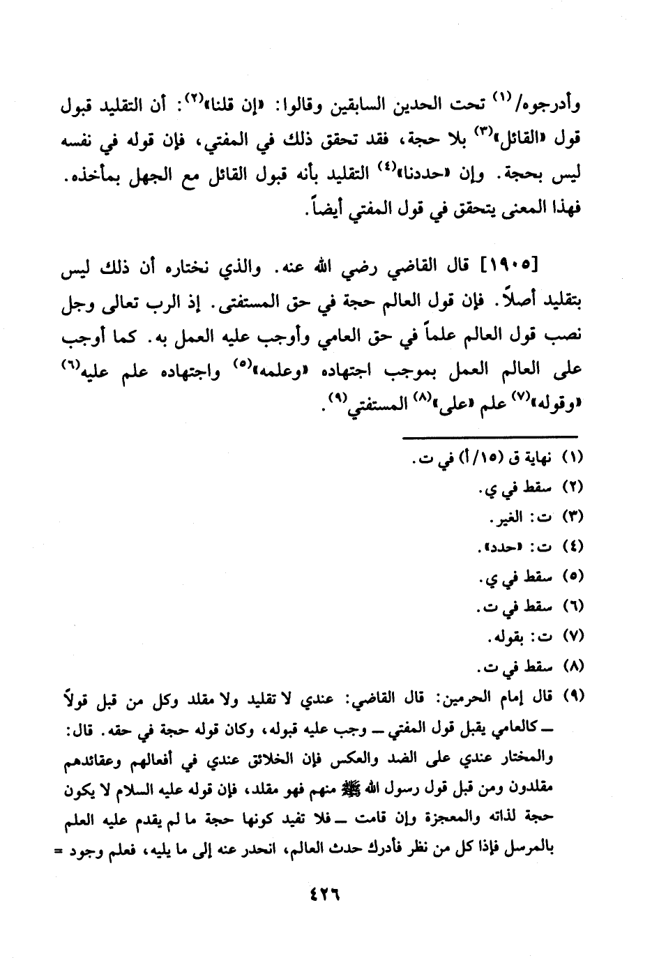 1905 - قَالَ القَاضِي رَضِي الله عَنهُ. وَالَّذِي نختاره أَن ذَلِك لَيْسَ بتقليد أصلا. فَإِن قَول الْعَالم حجَّة فِي حق المستفتى. إِذْ الرب تَعَالَى وَجل نصب قَول الْعَالم علما فِي حق الْعَاميّ وَأوجب عَلَيْهِ الْعَمَل بِهِ. كَمَا أوجب على الْعَالم الْعَمَل بِمُوجب اجْتِهَاده " وَعلمه " واجتهاده علم عَلَيْهِ " وَقَوله " علم " على " المستفتي.