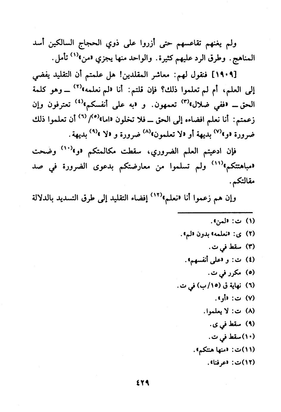 1909 - فَنَقُول لَهُم: معاشر المقلدين! هَل علمْتُم أَن التَّقْلِيد يُفْضِي إِلَى الْعلم، أم لم تعلمُوا ذَلِك؟ فَإِن قُلْتُمْ: أَنا " لم نعلمهُ " - هُوَ كلمة الْحق - " فَفِي ضلال " تعمهون. و " بِهِ على أَنفسكُم " تعترفون وَإِن زعمتم: أَنا نعلم افضاءه إِلَى الْحق - فَلَا تخلون " اما " أَن تعلمُوا ذَلِك ضَرُورَة " و " بديهة أَو " لاتعلمون " ضَرُورَة و " لَا " بديهة.