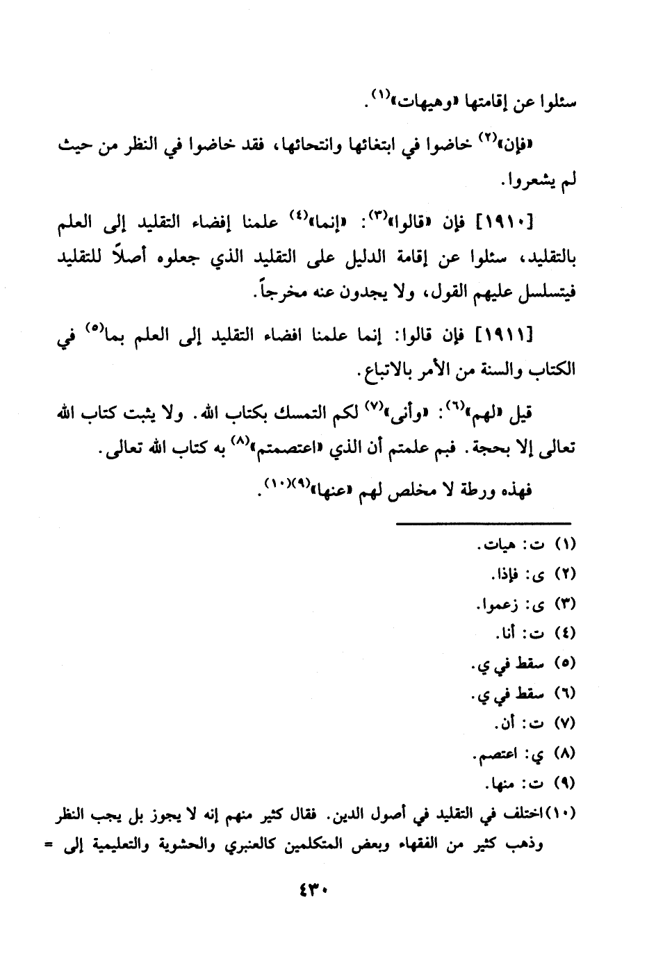 1910 - فَإِن " قَالُوا ": " إِنَّمَا " علمنَا إفضاء التَّقْلِيد إِلَى الْعلم بالتقليد، سئلوا عَن إِقَامَة الدَّلِيل على التَّقْلِيد الَّذِي جَعَلُوهُ أصلا للتقليد فيتسلسل عَلَيْهِم القَوْل، وَلَا يَجدونَ عَنهُ مخرجا.
