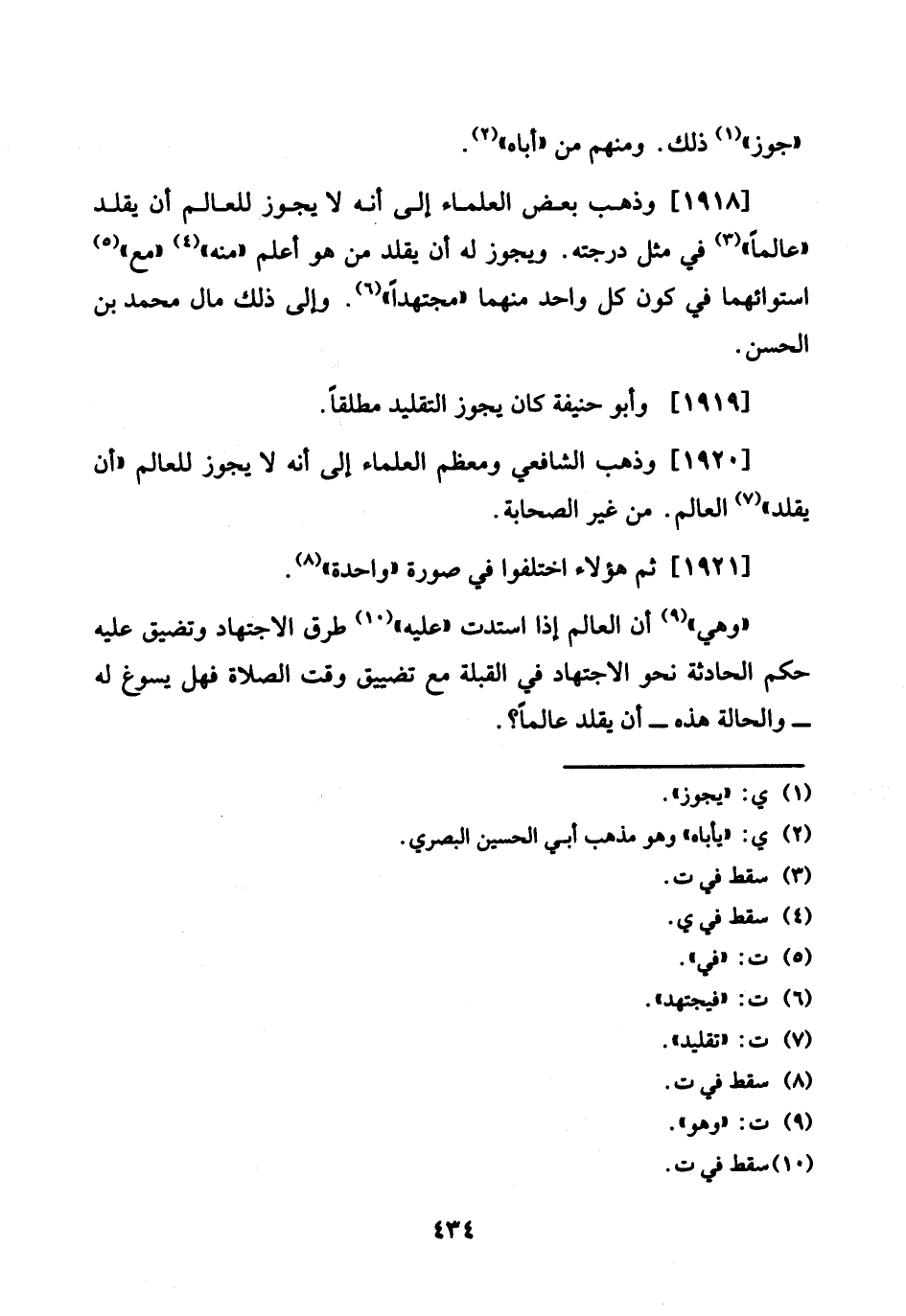 1920 - وَذهب الشَّافِعِي ومعظم الْعلمَاء إِلَى أَنه لَا يجوز للْعَالم " أَن يُقَلّد " الْعَالم. من غير الصَّحَابَة.