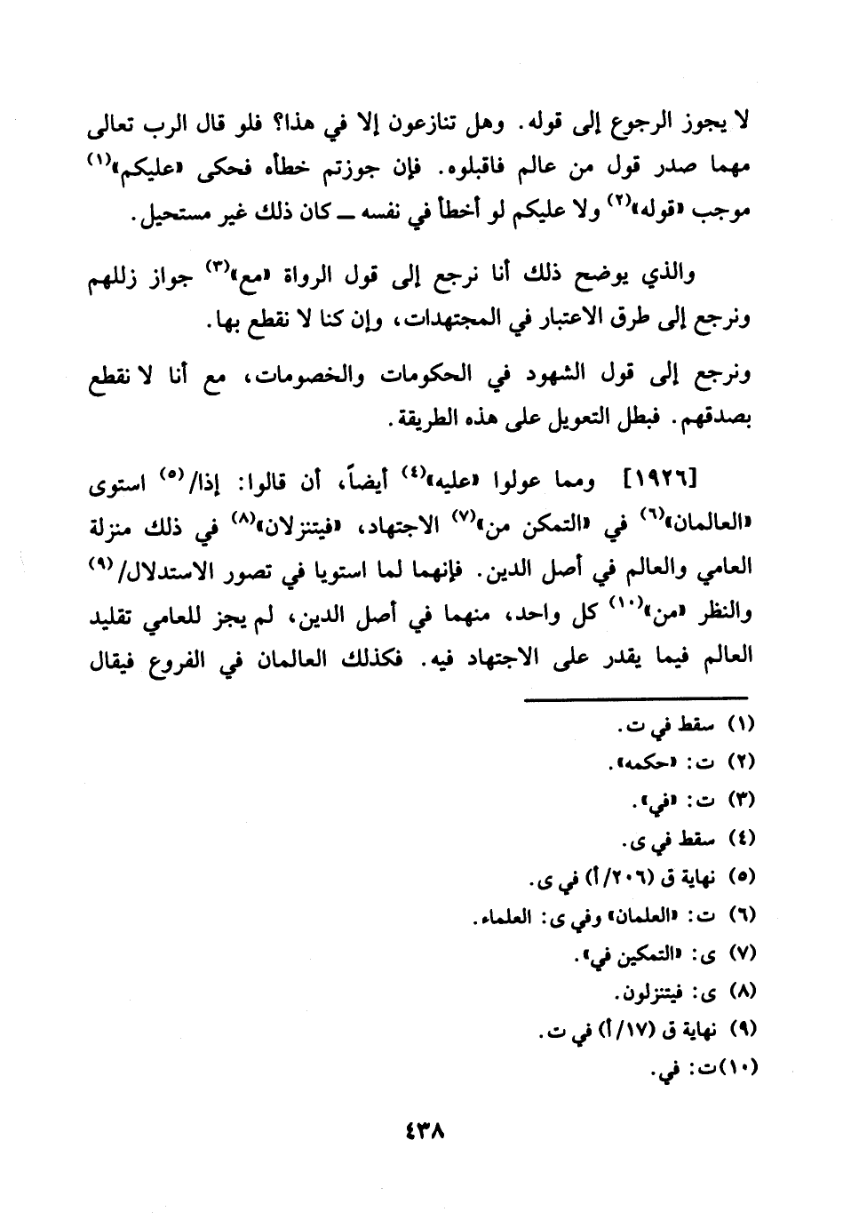 1926 - وَمِمَّا عولوا " عَلَيْهِ " أَيْضا، أَن قَالُوا: إِذا / اسْتَوَى " العالمان " فِي " التَّمَكُّن من " الِاجْتِهَاد، " فيتنزلان " فِي ذَلِك منزلَة الْعَاميّ والعالم فِي أصل الدّين. فَإِنَّهُمَا لما اسْتَويَا فِي تصور الِاسْتِدْلَال / وَالنَّظَر من كل وَاحِد، مِنْهُمَا فِي أصل الدّين، لم يجز للعامي تَقْلِيد الْعَالم فِيمَا يقدر على الِاجْتِهَاد فِيهِ. فَكَذَلِك العالمان فِي الْفُرُوع فَيُقَال
