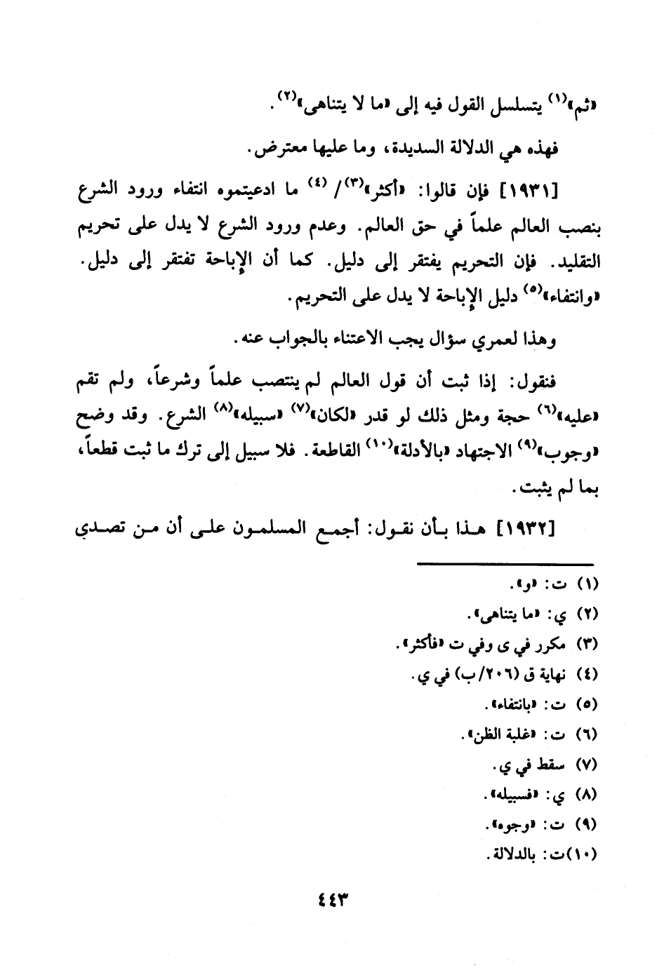 فَنَقُول: إِذا ثَبت أَن قَول الْعَالم لم ينْتَصب علما وَشرعا، وَلم تقم " عَلَيْهِ " حجَّة وَمثل ذَلِك لَو قدر " لَكَانَ " " سَبيله " الشَّرْع. وَقد وضح " وجوب " الِاجْتِهَاد " بالأدلة " القاطعة. فَلَا سَبِيل إِلَى ترك مَا ثَبت قطعا، بِمَا لم يثبت.