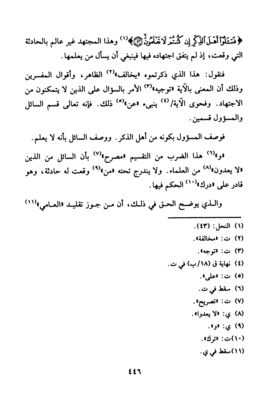 فَنَقُول: هَذَا الَّذِي ذكرتموه " يُخَالف " الظَّاهِر، وأقوال الْمُفَسّرين وَذَلِكَ أَن الْمَعْنى بِالْآيَةِ " تَوْجِيه " الْأَمر بالسؤال على الَّذين لَا يتمكنون من الِاجْتِهَاد. وفحوى الْآيَة / يُنبئ " عَن " ذَلِك. فَإِنَّهُ تَعَالَى قسم السَّائِل والمسؤول قسمَيْنِ.