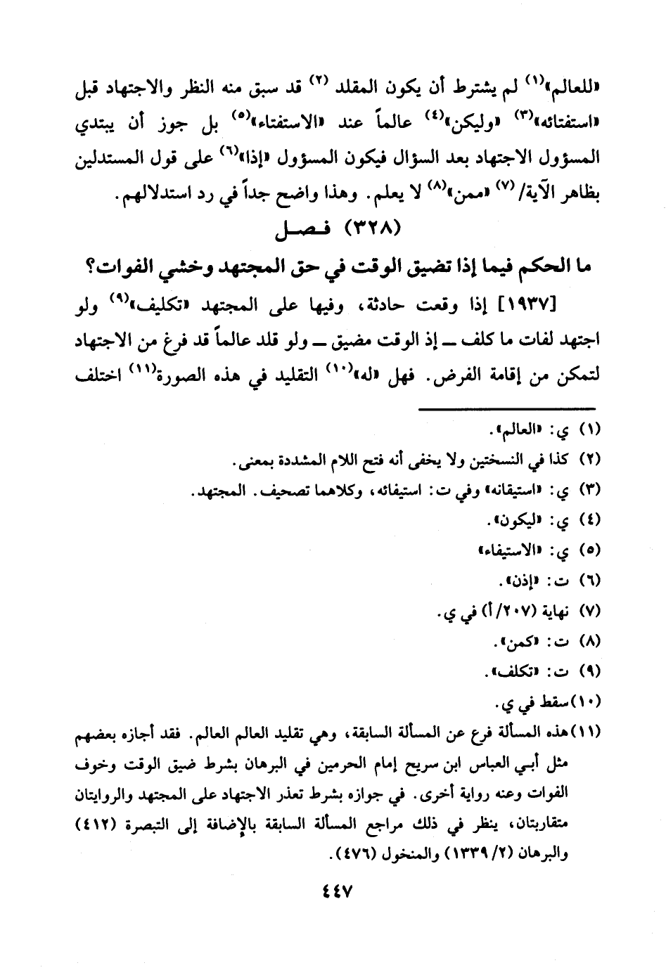 1937 - إِذا وَقعت حَادِثَة، وفيهَا على الْمُجْتَهد " تَكْلِيف " وَلَو اجْتهد لفات مَا كلف - إِذْ الْوَقْت مضيق - وَلَو قلد عَالما قد فرغ من الِاجْتِهَاد لتمكن من إِقَامَة الْفَرْض. فَهَل " لَهُ " التَّقْلِيد فِي هَذِه الصُّورَة اخْتلف