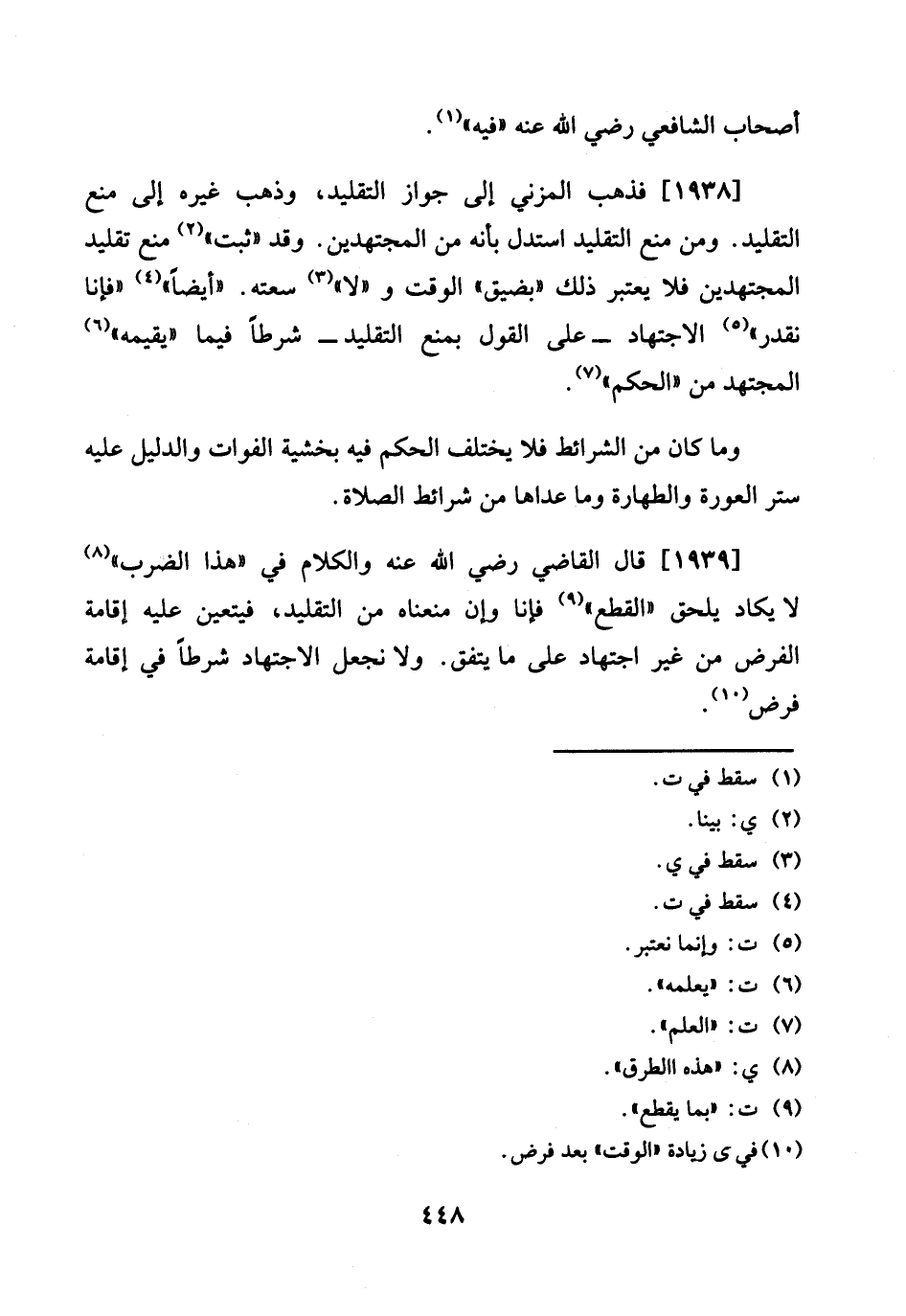 1938 - فَذهب الْمُزنِيّ إِلَى جَوَاز التَّقْلِيد، وَذهب غَيره إِلَى منع التَّقْلِيد. وَمن منع التَّقْلِيد اسْتدلَّ بِأَنَّهُ من الْمُجْتَهدين. وَقد " ثَبت " منع تَقْلِيد الْمُجْتَهدين فَلَا يعْتَبر ذَلِك " بِضيق " الْوَقْت و " لَا " سعته. " أَيْضا " " فَإنَّا نقدر " الِاجْتِهَاد - على القَوْل بِمَنْع التَّقْلِيد - شرطا فِيمَا " يقيمه " الْمُجْتَهد من " الحكم ".