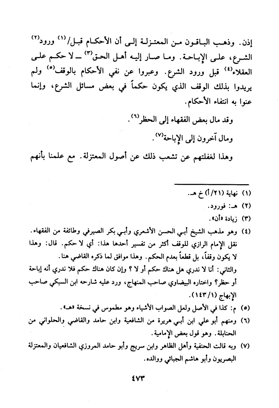 إِذن وَذهب الْبَاقُونَ من الْمُعْتَزلَة إِلَى أَن الْأَحْكَام قبل / وُرُود الشَّرْع، على الْإِبَاحَة. وَمَا صَار إِلَيْهِ أهل الْحق - لَا حكم على الْعُقَلَاء قبل وُرُود الشَّرْع. وعبروا عَن نفي الْأَحْكَام بِالْوَقْفِ وَلم يُرِيدُوا بذلك الْوَقْف الَّذِي يكون حكما فِي بعض مسَائِل الشَّرْع، وَإِنَّمَا عنوا بِهِ انْتِفَاء الْأَحْكَام.