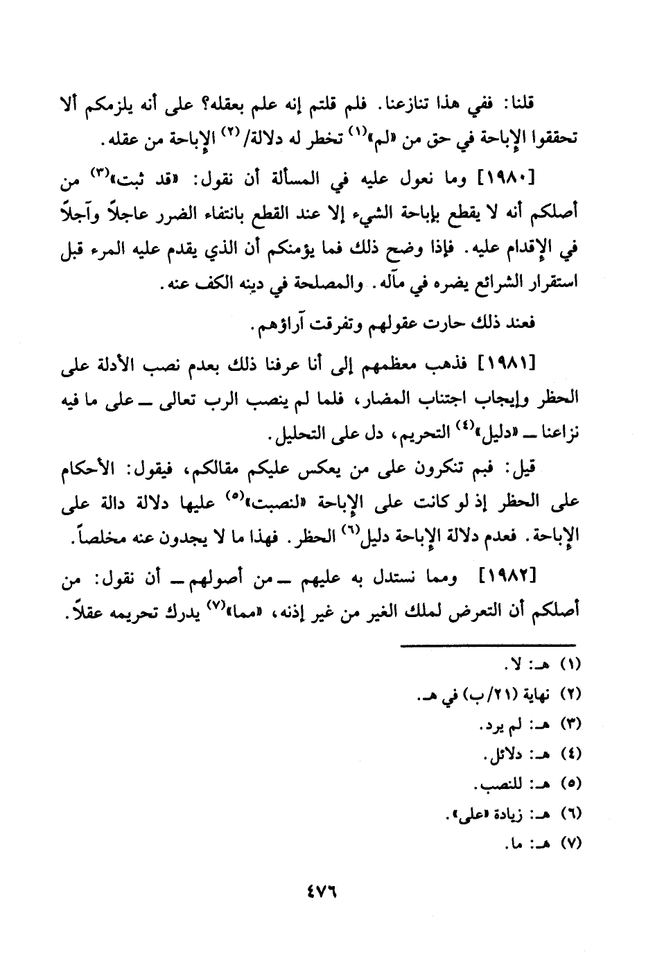 1981 - فَذهب معظمهم إِلَى أَنا عرفنَا ذَلِك بِعَدَمِ نصب الْأَدِلَّة على الْحَظْر وَإِيجَاب اجْتِنَاب المضار، فَلَمَّا لم ينصب الرب تَعَالَى - على مَا فِيهِ نزاعنا - " دَلِيل " التَّحْرِيم، دلّ على التَّحْلِيل.