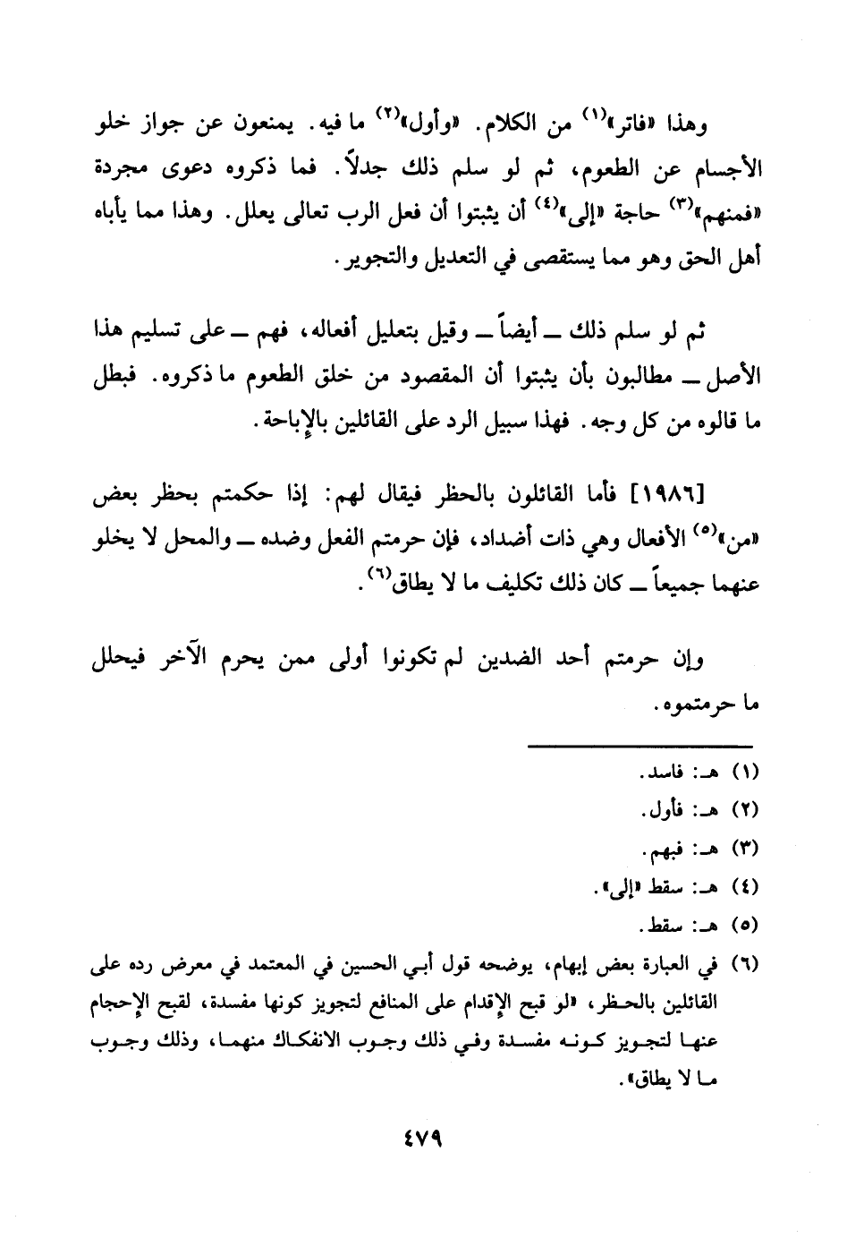 1986 - فَأَما الْقَائِلُونَ بالحظر فَيُقَال لَهُم: إِذا حكمتم بحظر بعض " من " الْأَفْعَال وَهِي ذَات أضداد، فَإِن حرمتم الْفِعْل وضده - وَالْمحل لَا يَخْلُو عَنْهُمَا جَمِيعًا - كَانَ ذَلِك تَكْلِيف مَا لَا يُطَاق.