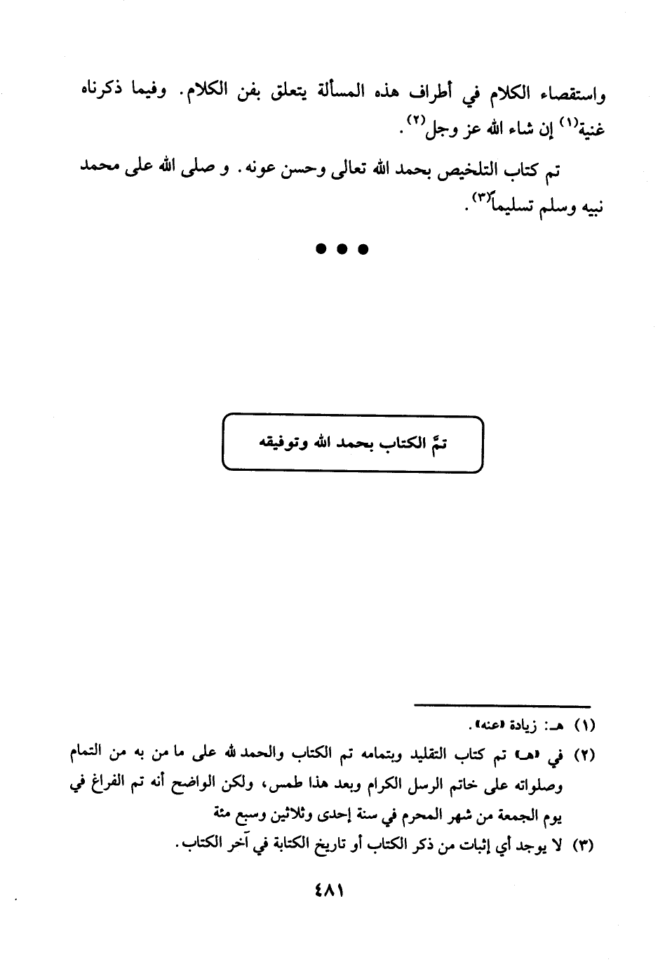 تمّ كتاب التَّلْخِيص بِحَمْد الله تَعَالَى وَحسن عونه. وَصلى الله على مُحَمَّد نبيه وَسلم تَسْلِيمًا.