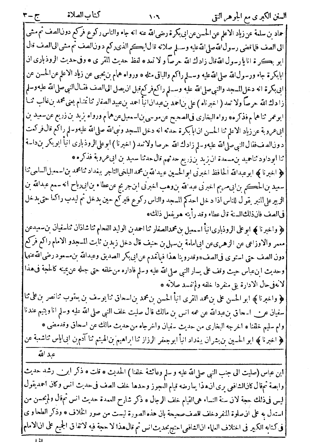 ابن عباس (صليت إلى جنب النبي صلى الله عليه وسلم وعائشة خلفنا) الحديث * قلت * ذكر ابن رشد حديث وابصة ثم قال كان الشافعي يرى ان هذا يعارضه قيام العجوز وحدها خلف الصف في حديث انس وكان احمد يقول ليس في ذلك حجة لان سنة النساء هي القيام خلف الرجال * ذكر شارح العمدة حديث انس ثم قال ولم يحسن من استدل به على ان صلوة المنفرد خلف الصف صحيحة بان هذه الصورة ليست من صور الخلاف * وذكر الطحاوي في كتابه الكبير في اختلاف العلماء ان الشافعي احتج بحديث انس ثم قال هذا لا حجة فيه لاتفاق الجميع على ان الامام