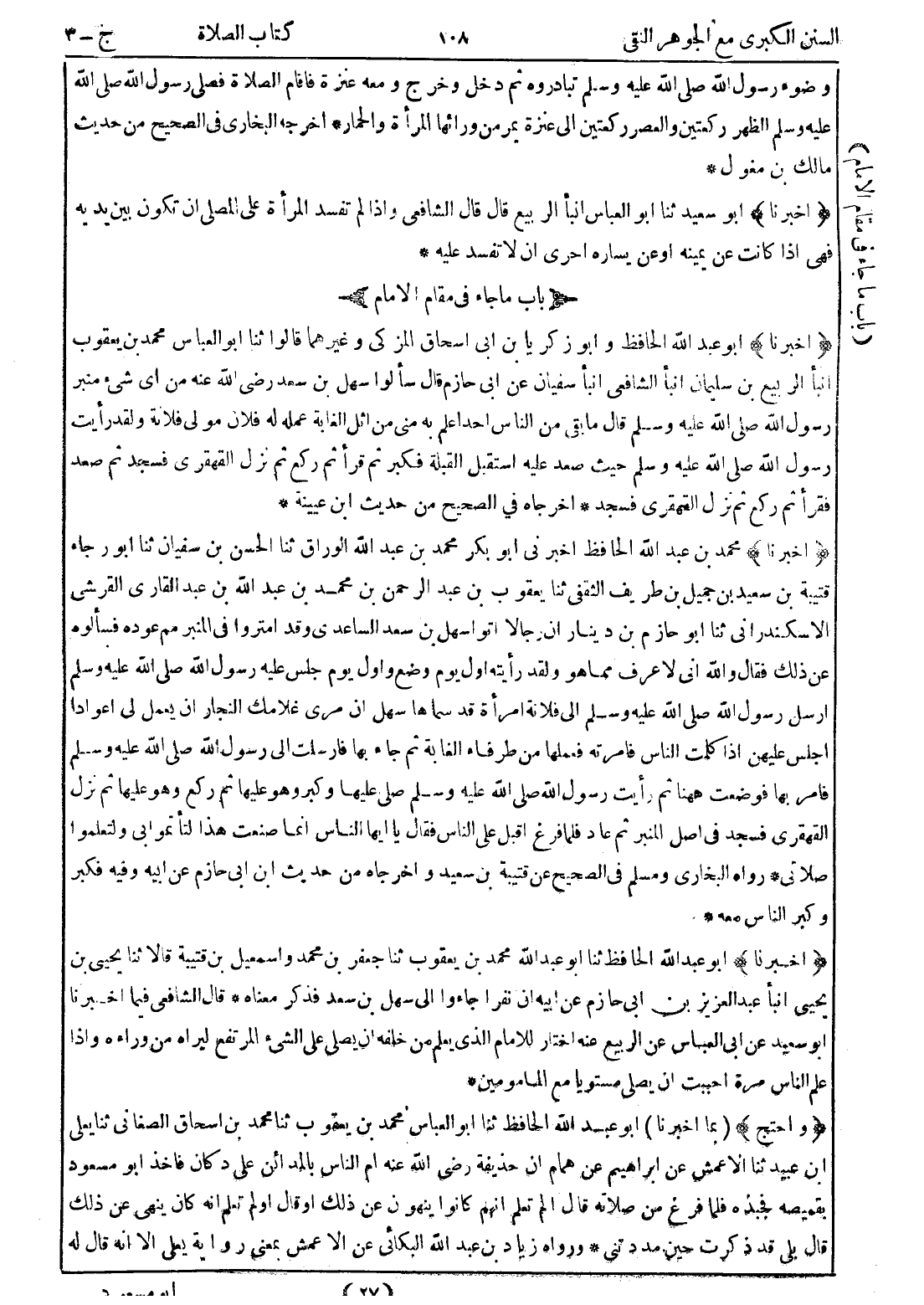(أخبرنا) محمد بن عبد الله الحافظ اخبرني أبو بكر محمد بن عبد الله الوراق ثنا الحسن بن سفيان ثنا أبو رجاء قتيبة بن سعيد بن جميل بن طريف الثقفي ثنا يعقوب بن عبد الرحمن بن محمد بن عبد الله بن عبد القاري القرشي الاسكندراني ثنا أبو حازم بن دينار ان رجالا اتوا سهل بن سعد الساعدي وقد امتروا في المنبر مم عوده فسألوه عن ذلك فقال والله اني لاعرف مما هو ولقد رأيته اول يوم وضع واول يوم جلس عليه رسول الله صلى الله عليه وسلم ارسل رسول الله صلى الله عليه وسلم إلى فلانة امرأة قد سماها سهل ان مرى غلامك النجار ان يعمل لي اعوادا اجلس عليهن إذا كلمت الناس فأمرته فعملها من طرفاء الغابة ثم جاء بها فارسلت إلى رسول الله صلى الله عليه وسلم فأمر بها فوضعت ههنا ثم رأيت رسول الله صلى الله عليه وسلم صلى عليها وكبر وهو عليها ثم ركع وهو عليها ثم نزل القهقري فسجد في اصل المنبر ثم عاد فلما فرغ اقبل على الناس فقال يا ايها الناس انما صنعت هذا لتأتموا بي ولتعلموا صلاتي * رواه البخاري ومسلم في الصحيح عن قتيبة بن سعيد واخرجاه من حديث ابن ابي حازم عن ابيه وفيه فكبر وكبر الناس معه *