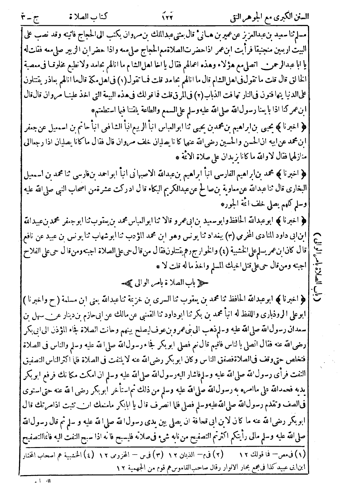 (أخبرنا) محمد بن ابراهيم الفارسي انبأ ابراهيم بن عبد الله الاصبهاني انبأ أبو احمد بن فارسي ثنا محمد بن اسمعيل البخاري قال ثنا عبد الله عن معاوية بن صالح عن عبد الكريم البكاء قال ادركت عشرة من اصحاب النبي صلى الله عليه وسلم كلهم يصلي خلف ائمة الجور *