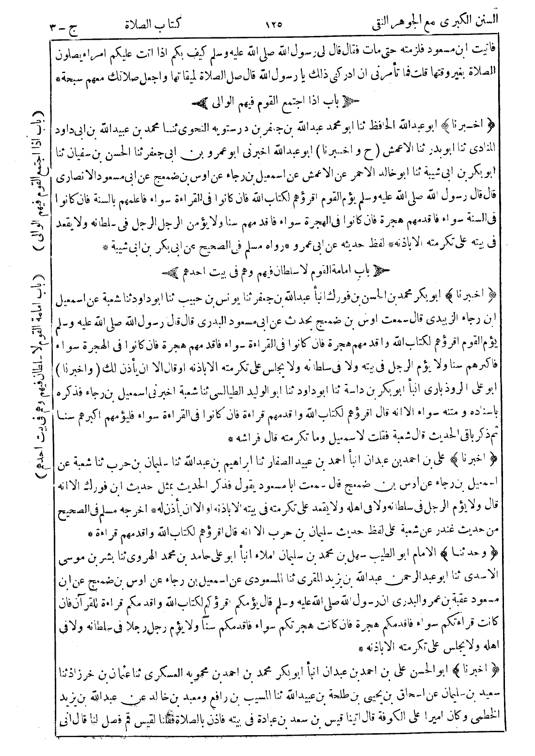مسعود عقبة بن عمرو البدري ان رسول الله صلى الله عليه وسلم قال يؤمكم اقرؤكم لكتاب الله واقدمكم قراءة للقرآن فإن كانت قراءتكم سواء فاقدمكم هجرة فإن كانت هجرتكم سواء فاقدمكم سنا ولا يؤم رجل رجلا في سلطانه ولا في اهله ولا يجلس على تكرمته الا باذنه *