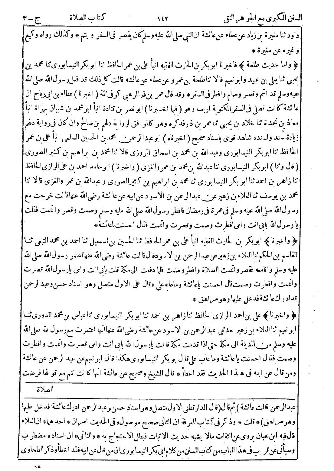 عبد الرحمن قالت عائشة) ثم قال (قال الدارقطني الاول متصل وهو اسناد حسن وعبد الرحمن ادرك عائشة فدخل عليها وهو مراهق) * قلت * وذكر في كتاب المعرفة ان الثاني صحيح موصول وفي الحديث امران * احدهما * ان العلاء قال فيه ابن حبان يروى عن الثقات مالا يشبه حديث الاثبات فبطل الاحتجاج به * والثاني * ان اسناده مضطرب وسيأتي عن قريب في هذا الباب من كتاب السنن من كلام ابي بكر النيسابوري ان من قال عن ابيه فقد اخطأ وذكر الطحاوي