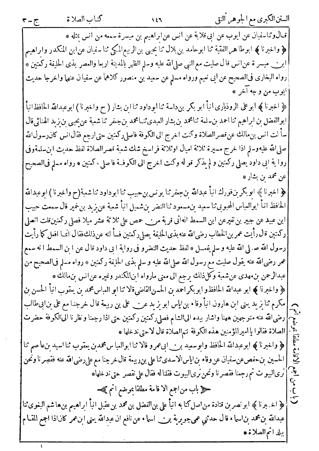 (أخبرنا) أبو نصر بن قتادة من اصل كتابه انبأ علي بن الفضل بن محمد بن عقيل انبأ ابراهيم بن هاشم البغوي ثنا عبد الله بن محمد بن اسماء قال حدثني عمى جويرية بن اسماء عن نافع ان عبد الله يعني ابن عمر كان إذا اجمع المقام ببلد اتم الصلاة *