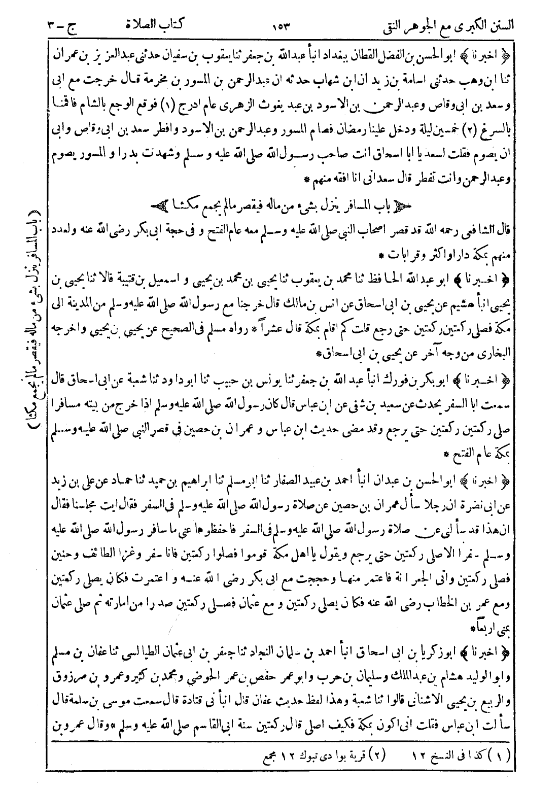 (أخبرنا) أبو الحسن بن عبدان انبأ احمد بن عبيد الصفار ثنا أبو مسلم ثنا ابراهيم بن حميد ثنا حماد عن علي بن زيد عن ابي نضرة ان رجلا سأل عمران بن حصين عن صلاة رسول الله صلى الله عليه وسلم في السفر فقال ايت مجلسنا فقال ان هذا قد سألني عن صلاة رسول الله صلى الله عليه وسلم في السفر فاحفظوها عني ما سافر رسول الله صلى الله عليه وسلم سفرا الا صلى ركعتين حتى يرجع ويقول يا اهل مكة قوموا فصلوا ركعتين فانا سفر وغزا الطائف وحنين