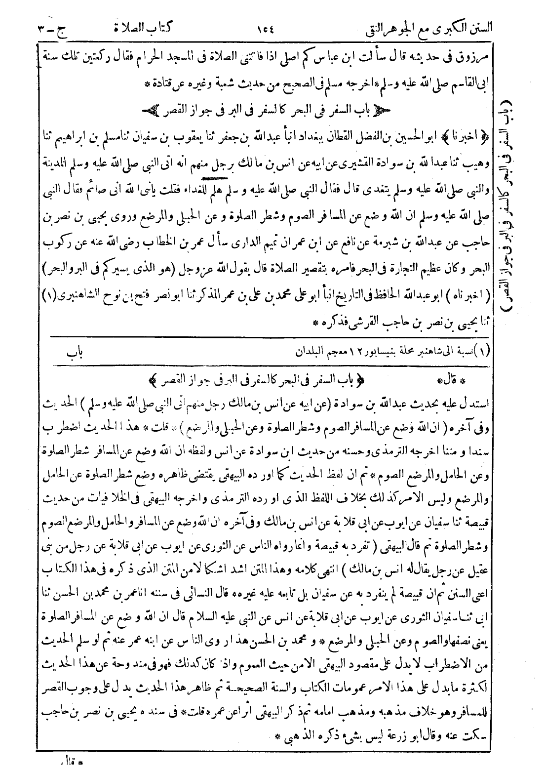 * قال * {باب السفر في البحر كالسفر في البر في جواز القصر} استدل عليه بحديث عبد الله بن سوادة (عن ابيه عن انس بن مالك رجل منهم اتى النبي صلى الله عليه وسلم) الحديث وفى آخره (ان الله وضع عن المسافر الصوم وشطر الصلوة وعن الحبلى والمرضع) * قلت * هذا الحديث اضطرب سندا ومتنا اخرجه الترمذي وحسنه من حديث ابن سوادة عن انس ولفظه ان الله وضع عن المسافر شطر الصلوة وعن الحامل والمرضع الصوم * تم ان لفظ الحديث كما اورده البيهقى يقتضى ظاهره وضع شطر الصلوة عن الحامل والمرضع وليس الامر كذلك بخلاف اللفظ الذى اورده الترمذي واخرجه البيهقى في الخلافيات من حديث