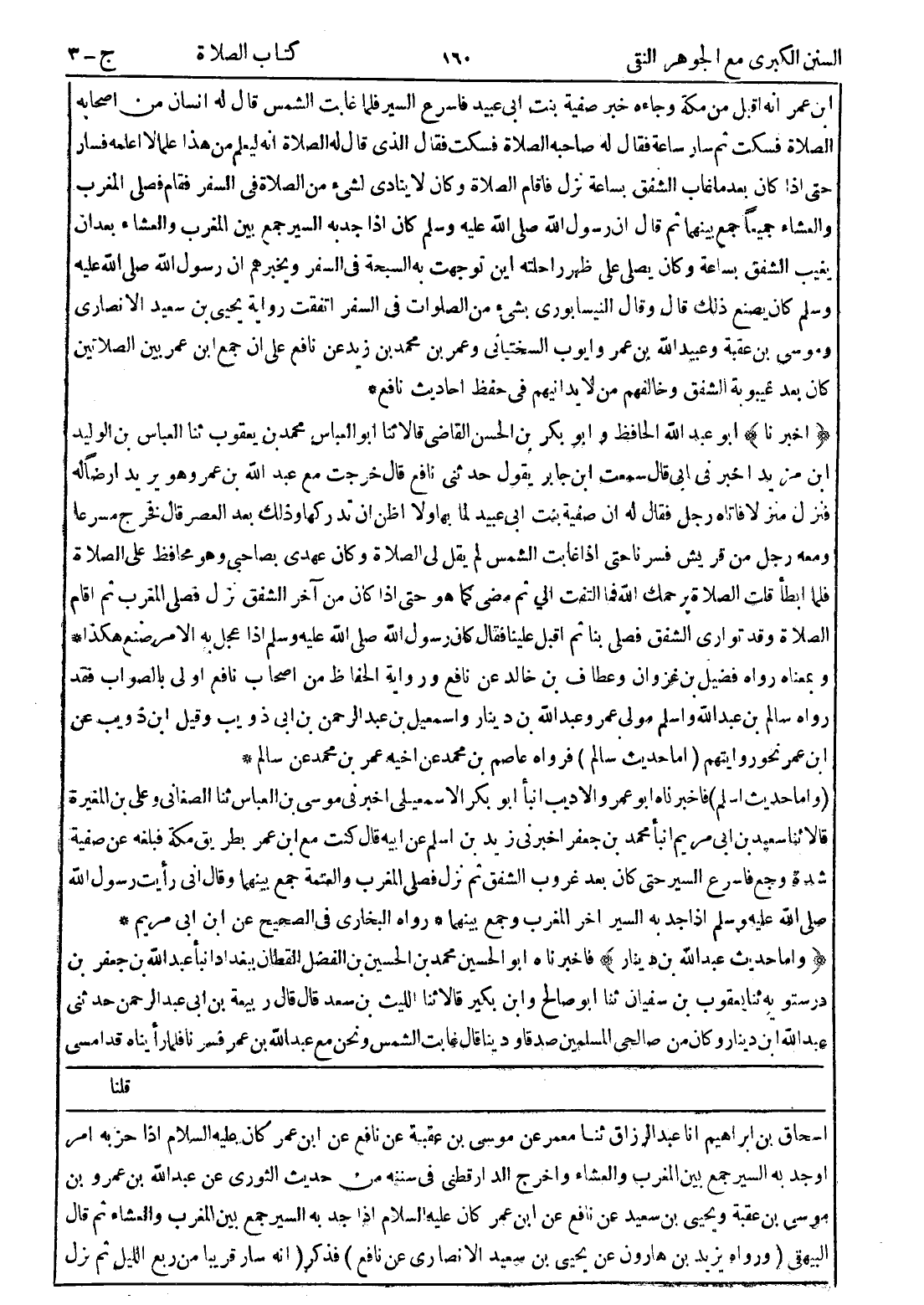 اسحاق بن ابراهيم انا عبد الرزاق ثنا معمر عن موسى بن عقبة عن نافع عن ابن عمر كان عليه السلام إذا حز به امر اوجد به السير جمع بين المغرب والعشاء واخرج الدارقطني في سننه من حديث الثوري عن عبد الله بن عمرو بن موسى بن عقبة ويحيى بن سعيد عن نافع عن ابن عمر كان عليه السلام إذا جد به السير جمع بين المغرب والعشاء ثم قال البيهقى (ورواه يزيد بن هارون عن يحيى بن سعيد الانصاري عن نافع) فذكر (انه سار قريبا من ربع الليل ثم نزل