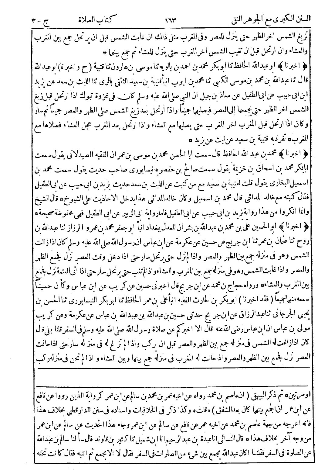 أو مرتين * ثم ذكر البيهقى (ان عاصم بن محمد رواه عن اخيه عمر بن محمد بن سالم عن ابن عمر كرواية الذين رووا عن نافع عن ابن عمر ان الجمع بينهما كان بعد الشفق) * قلت * وكذا ذكر في الخلافيات واسناده في سنن الدارقطني بخلاف هذا فانه اخرجه من جهة عاصم بن محمد عن اخيه عمر عن نافع عن سالم عن ابن عمر وجاء هذا الحديث عن سالم عن ابن عمر من وجه آخر بخلاف هذا * قال النسائي انا عبدة بن عبد الرحيم انا ابن شميل ثنا كثير بن قاوند قال سألنا سالم بن عبد الله عن الصلوة في السفر فقلنا اكان عبد الله يجمع بين شئ من الصلوات في السفر فقال لا الا يجمع؟؟ ثم انتبه فقال كانت تحته
