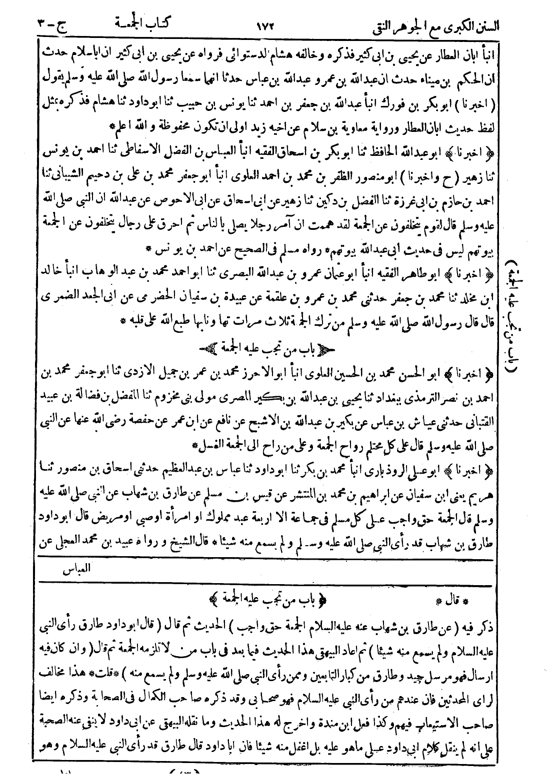 * قال * {باب من تجب عليه الجمعة} ذكر فيه (عن طارق بن شهاب عنه عليه السلام الجمعة حق واجب) الحديث ثم قال (قال أبو داود طارق رأى النبي عليه السلام ولم يسمع منه شيئا) ثم اعاد البيهقى هذا الحديث فيما بعد في باب من لا تلزمه الجمعة ثم قال (وان كان فيه ارسال فهو مرسل جيد وطارق من كبار التابعين وممن رأى النبي صلى الله عليه وسلم ولم يسمع منه) * قلت * هذا مخالف لراى المحدثين فان عندهم من رأى النبي عليه السلام فهو صحابي وقد ذكره صاحب الكمال في الصحابة وذكره ايضا صاحب الاستيعاب فيهم وكذا فعل ابن مندة واخرج له هذا الحديث وما نقله البيهقى عن ابى داود لا ينفى عنه الصحبة على انه لم ينقل كلام ابى داود على ما هو عليه بل اغفل منه شيئا فان ابا داود قال طارق قد رأى النبي عليه السلام وهو