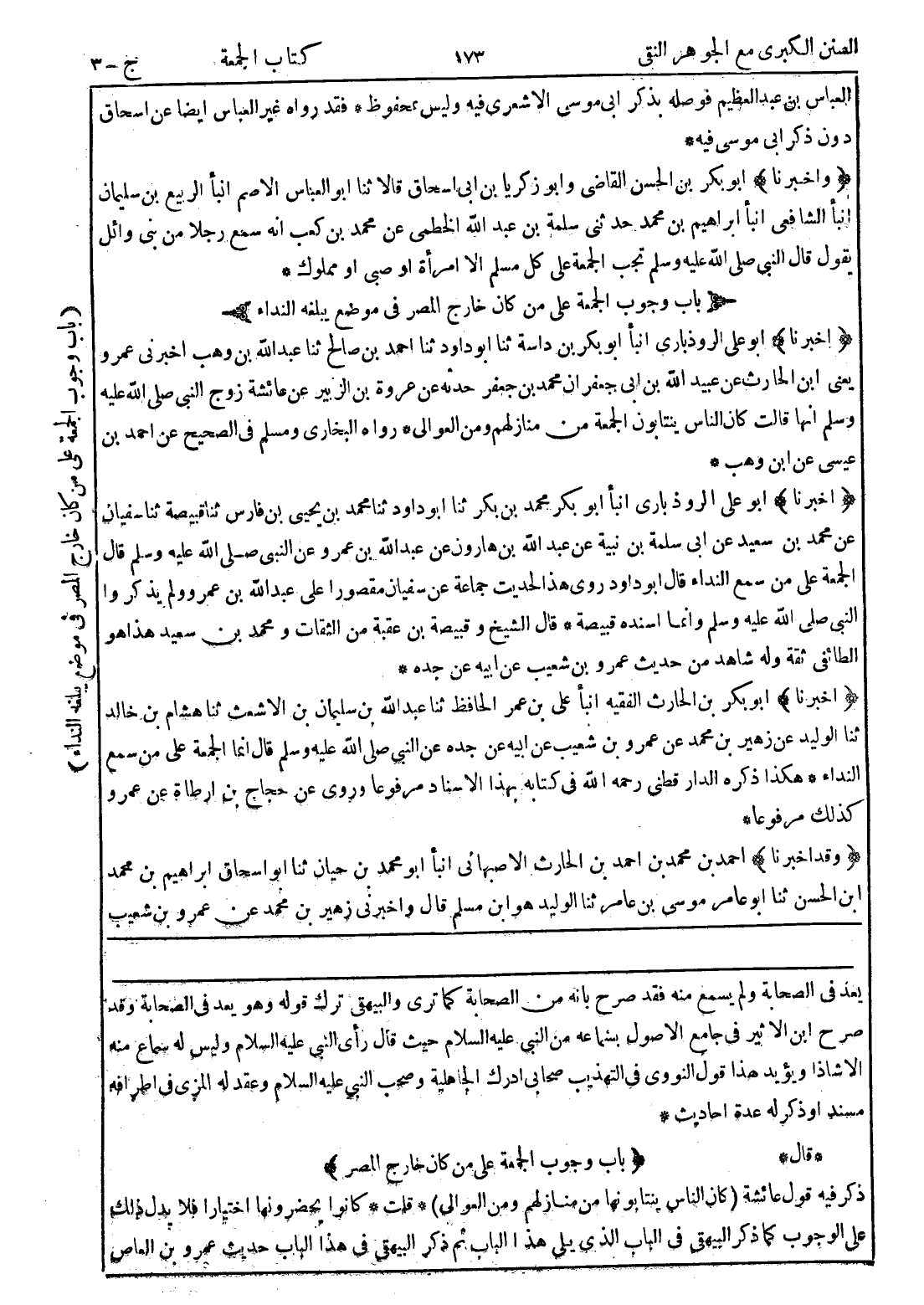 يعد في الصحابة ولم يسمع منه فقد صرح بانه من الصحابة كما ترى والبيهقي ترك قوله وهو يعد في الصحابة وقد صرح ابن الاثير في جامع الاصول بسماعه من النبي عليه السلام حيث قال رأى النبي عليه السلام وليس له سماع منه الا شاذا ويؤيد هذا قول النووي في التهذيب صحابي ادرك الجاهلية وصحب النبي عليه السلام وعقد له المزى في اطرافه مسند أو ذكر له عدة احاديث * * قال * {باب وجوب الجمعة على من كان خارج المصر} ذكر فيه قول عائشة (كان الناس ينتابونها من منازلهم ومن العوالي) * قلت * كانوا يحضرونها اختيارا فلا يدل ذلك على الوجوب كما ذكر البيهقى في الباب الذى يلى هذا الباب ثم ذكر البيهقى في هذا الباب حديث عمرو بن العاص