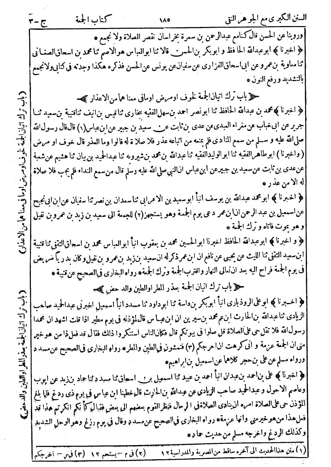 (أخبرنا) أبو علي الروذباري انبأ أبو بكر بن داسة ثنا أبو داود ثنا مسدد انبأ اسمعيل اخبرني عبد الحميد صاحب الزيادي ثنا عبد الله بن الحارث ابن عم محمد بن سيرين ان ابن عباس قال لمؤذنه في يوم مطير إذا قلت اشهد ان محمدا رسول الله فلا تقل حي على الصلاة قل صلوا في بيوتكم قال فكان الناس استنكروا ذلك فقال قد فعل ذا من هو خير مني ان الجمعة عزمة واني كرهت ان احرجكم (3) فتمشون في الطين والمطر * رواه البخاري في الصحيح عن مسدد ورواه مسلم عن علي بن حجر كلاهما عن اسمعيل بن ابراهيم *