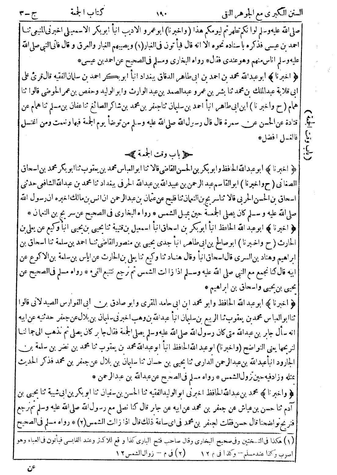 (وأخبرنا) محمد بن عبد الله الحافظ اخبرني أبو الوليد الفقيه ثنا الحسن بن سفيان ثنا أبو بكر بن ابي شيبة ثنا يحيى بن آدم ثنا حسن بن عياش عن جعفر بن محمد عن ابيه عن جابر قال كنا نصلي مع رسول الله صلى الله عليه وسلم ثم نرجع فنريح نواضحنا قال حسن فقلت لجعفر بن محمد في اي ساعة ذلك قال إذا زالت الشمس (2) * رواه مسلم في الصحيح