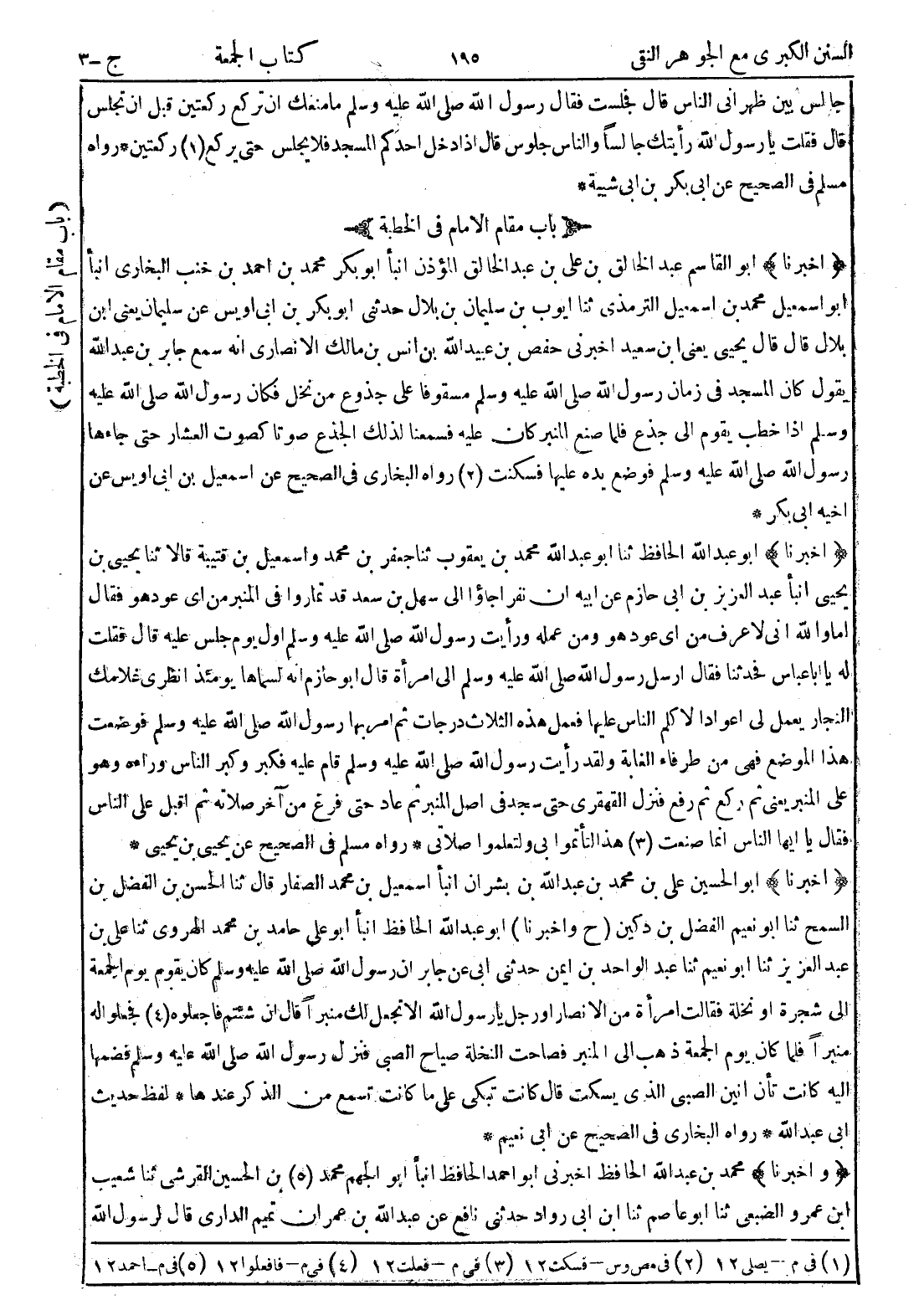 (أخبرنا) أبو القاسم عبد الخالق بن علي بن عبد الخالق المؤذن انبأ أبو بكر محمد بن احمد بن خنب البخاري انبأ أبو اسمعيل محمد بن اسمعيل الترمذي ثنا ايوب بن سليمان بن بلال حدثني أبو بكر بن ابي اويس عن سليمان يعني ابن بلال قال قال يحيى يعني ابن سعيد اخبرني حفص بن عبيد الله بن انس بن مالك الانصاري انه سمع جابر بن عبد الله يقول كان المسجد في زمان رسول الله صلى الله عليه وسلم مسقوفا على جذوع من نخل فكان رسول الله صلى الله عليه وسلم إذا خطب يقوم إلى جذع فلما صنع المنبر كان عليه فسمعنا لذلك الجذع صوتا كصوت العشار حتى جاءها رسول الله صلى الله عليه وسلم فوضع يده عليها فسكنت (2) رواه البخاري في الصحيح عن اسمعيل بن ابي اويس عن اخيه ابي بكر *