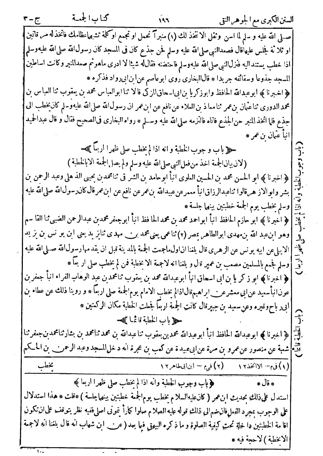 * قال * {باب وجوب الخطبة وانه إذا لم يخطب صلى ظهرا اربعا} استدل على ذلك بحديث ابن عمر (كان عليه السلام يخطب يوم الجمعة خطبتين بينهما جلسة) * قلت * هذا استدلال على الوجوب بمجرد الفعل فان ضم إلى ذلك قوله عليه السلام؟؟؟ صلوا كما رأيتموني اصلى ففيه نظر يتوقف على ان تكون اقامة الخطبتين داخلة تحت كيفية الصلوة وما ذكره البيهقى فيما بعد (عن ابن شهاب انه قال بلغنا انه لا جمعة الا بخطبة) لا حجة فيه *