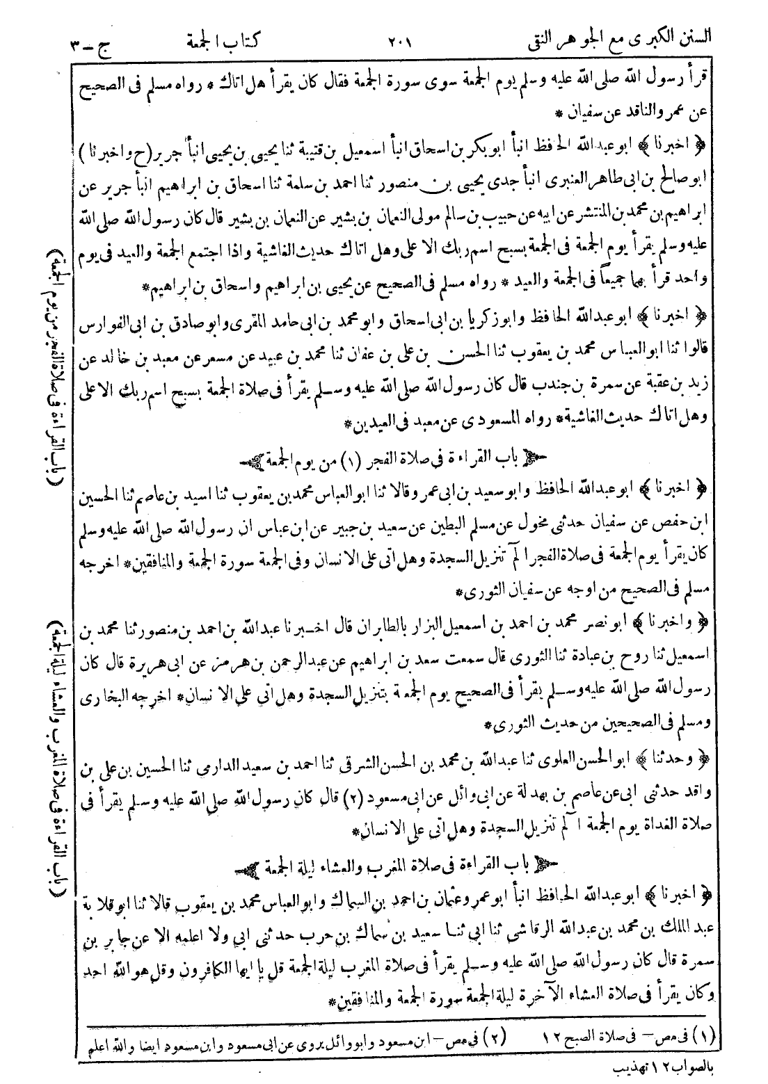 (وأخبرنا) أبو نصر محمد بن احمد بن اسمعيل البزار بالطابران قال اخبرنا عبد الله بن احمد بن منصور ثنا محمد بن اسمعيل ثنا روح بن عبادة ثنا الثوري قال سمعت سعد بن ابراهيم عن عبد الرحمن بن هرمز عن ابي هريرة قال كان رسول الله صلى الله عليه وسلم يقرأ في الصحيح يوم الجمعة بتنزيل السجدة وهل اتى على الانسان * اخرجه البخاري ومسلم في الصحيحين من حديث الثوري *