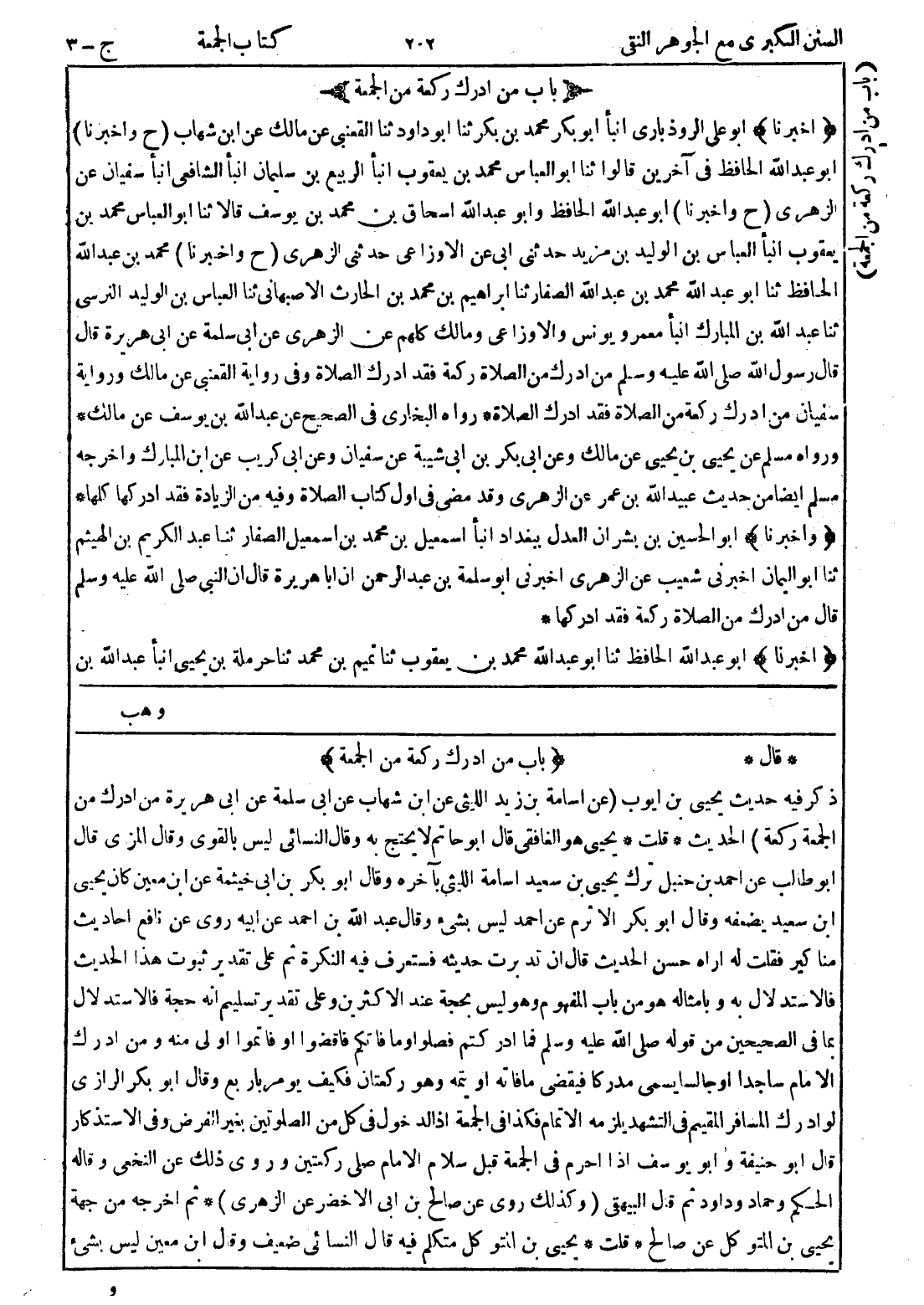 * قال * {باب من ادرك ركعة من الجمعة} ذكر فيه حديث يحيى بن ايوب (عن اسامة بن زيد الليثى عن ابن شهاب عن ابى سلمة عن ابى هريرة من ادرك من الجمعة ركعة) الحديث * قلت * يحيى هو الغافقي قال أبو حاتم لا يحتج به وقال النسائي ليس بالقوى وقال المزى قال أبو طالب عن احمد بن حنبل ترك يحيى بن سعيد اسامة الليثى بآخره وقال أبو بكر بن ابى خيثمة عن ابن معين كان يحيى ابن سعيد يضعفه وقال أبو بكر الاثرم عن احمد ليس بشئ وقال عبد الله بن احمد بن ابيه روى عن نافع احاديث مناكير فقلت له اراه حسن الحديث قال ان تدبرت حديثه فستعرف فيه النكرة ثم على تقدير ثبوت هذا الحديث فالاستدلال به وبامثاله هو من باب المفهوم وهو ليس بحجة عند الاكثرين وعلى تقدير تسليم انه حجة فالاستدلال بما في الصحيحين من قوله صلى الله عليه وسلم فما ادركتم فصلوا وما فاتكم فاقضوا أو فاتموا اولى منه ومن ادرك الامام ساجدا أو جالسا يسمى مدركا فيقضى ما فاته أو يتمه وهو ركعتان فكيف يومر باربع وقال أبو بكر الرازي لو ادرك المسافر المقيم في التشهد يلزمه الاتمام فكذا في الجمعة إذ الدخول في كل من الصلوتين بغير الفرض وفى الاستذكار قال أبو حنيفة وابو يوسف إذا احرم في الجمعة قبل سلام الامام صلى ركعتين وروى ذلك عن النخعي وقاله الحكم وحماد وداود ثم قال البيهقى (وكذلك روى عن صالح بن ابى الاخضر عن الزهري) * ثم اخرجه من جهة يحيى بن المتوكل عن صالح * قلت * يحيى بن المتوكل متكلم فيه قال النسائي ضعيف وقال ابن معين ليس بشئ