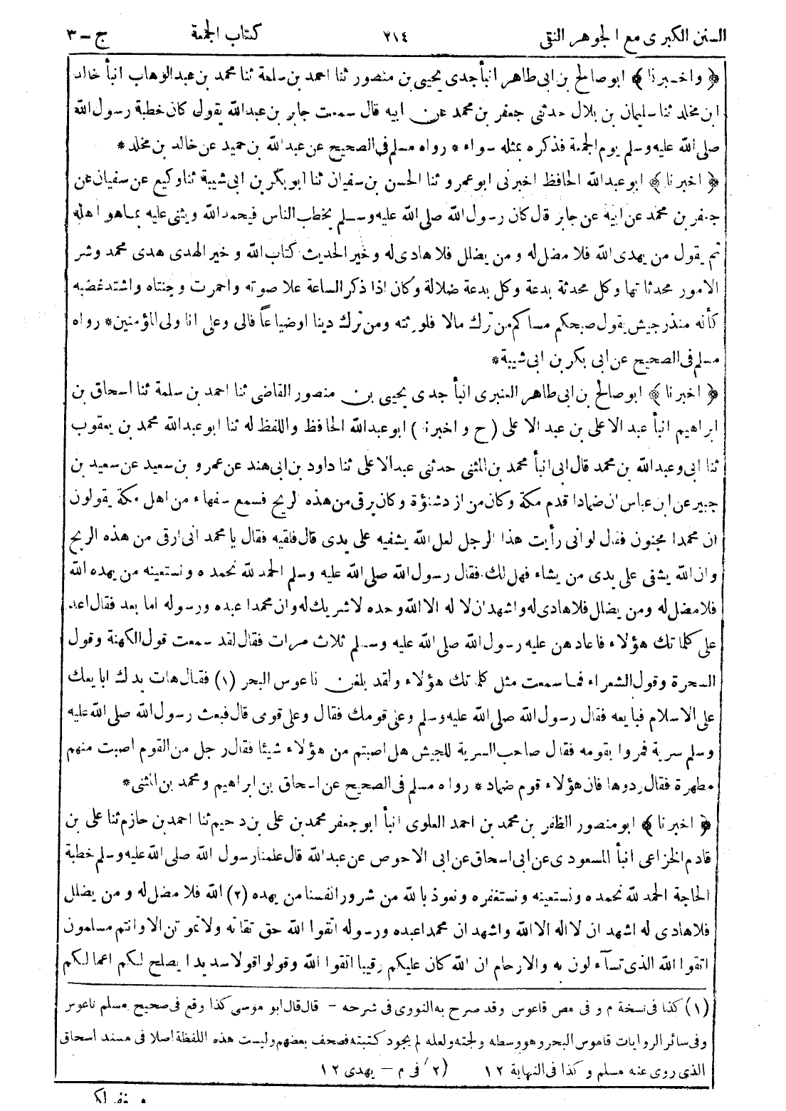 (وأخبرنا) أبو صالح بن ابي طاهر انبأ جدي يحيى بن منصور ثنا احمد بن سلمة ثنا محمد بن عبد الوهاب انبأ خالد ابن مخلد ثنا سليمان بن بلال حدثني جعفر بن محمد عن ابيه قال سمعت جابر بن عبد الله يقول كان خطبة رسول الله صلى الله عليه وسلم يوم الجمعة فذكره بمثله سواء * رواه مسلم في الصحيح عن عبد الله بن حميد عن خالد بن مخلد *