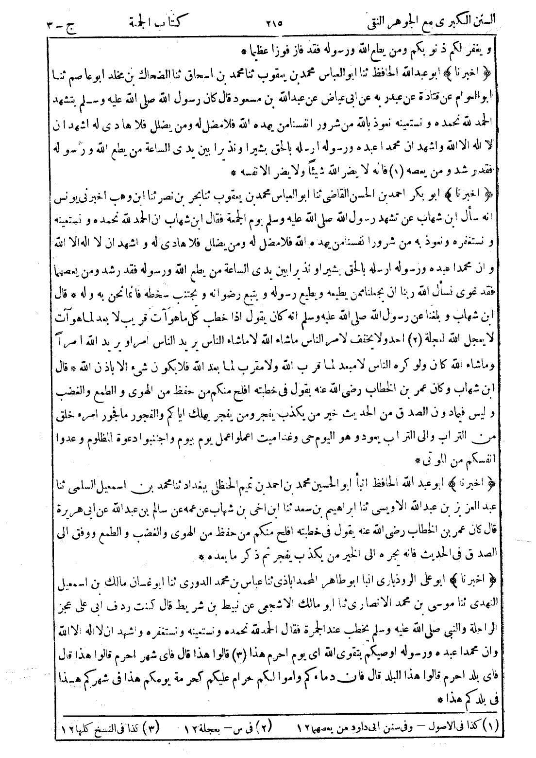 (أخبرنا) أبو علي الروذباري انبأ أبو طاهر المحمد اباذي ثنا عباس بن محمد الدوري ثنا أبو غسان مالك بن اسمعيل النهدي ثنا موسى بن محمد الانصاري ثنا أبو مالك الاشجعي عن نبيط بن شريط قال كنت ردف ابي على عجز الراحلة والنبي صلى الله عليه وسلم يخطب عند الجمرة فقال الحمد لله نحمده ونستعينه ونستغفره واشهد ان لا اله الا الله وان محمدا عبده ورسوله اوصيكم بتقوى الله أي يوم احرم هذا (3) قالوا هذا قال فاى شهر احرم قالوا هذا قال فاى بلد احرم قالوا هذا البلد قال فان دماءكم واموالكم حرام عليكم كحرمة يومكم هذا في شهركم هذا في بلدكم هذا *