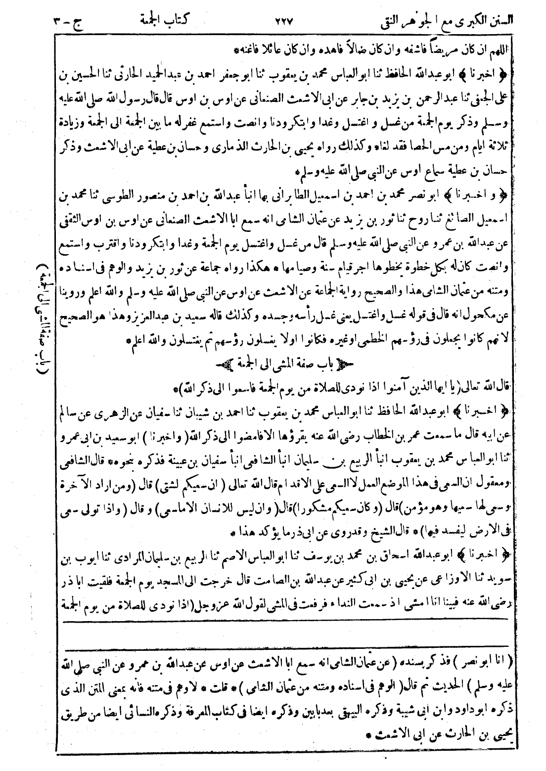 (انا أبو نصر) فذكر بسنده (عن عثمان الشامي انه سمع ابا الاشعث عن اوس عن عبد الله بن عمرو عن النبي صلى الله عليه وسلم) الحديث ثم قال (الوهم في اسناده ومتنه من عثمان الشامي) * قلت * لا وهم في متنه فانه بمعنى المتن الذى ذكره أبو داود وابن ابى شيبة وذكره البيهقى بعد بابين وذكره ايضا في كتاب المعرفة وذكره النسائي ايضا من طريق يحيى بن الحارث عن ابى الاشعث *
