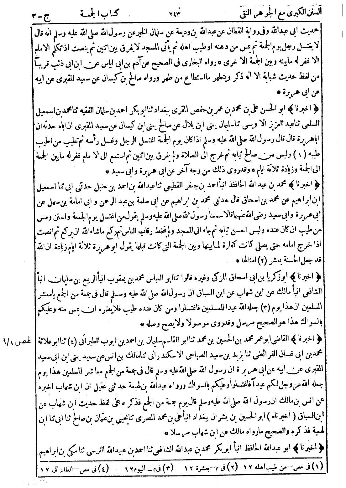(أخبرنا) محمد بن عبد الله الحافظ انبأ احمد بن جعفر القطيعي ثنا عبد الله بن احمد بن حنبل حدثني ابي ثنا اسمعيل ابن ابراهيم عن محمد بن اسحاق قال حدثني محمد بن ابراهيم عن ابي سلمة بن عبد الرحمن وابي امامة بن سهل عن ابي هريرة وابي سعيد رضي الله عنهما قالا سمعنا رسول الله صلى الله عليه وسلم يقول من اغتسل يوم الجمعة واستن ومس