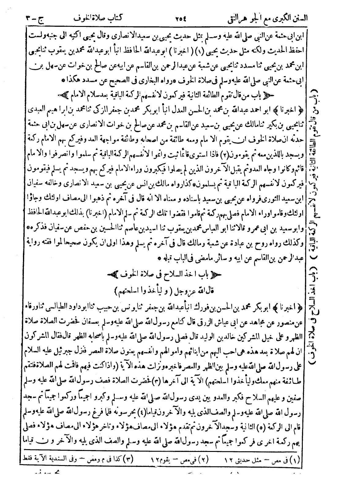 (أخبرنا) أبو بكر محمد بن الحسن بن فورك انبأ عبد الله بن جعفر ثنا يونس بن حبيب ثنا أبو داود الطيالسي ثنا ورقاء عن منصور عن مجاهد عن ابي عياش الزرقي قال كنا مع رسول الله صلى الله عليه وسلم بعسفان فحضرت الصلاة صلاة الظهر وعلى خيل المشركين خالد بن الوليد قال فصلى رسول الله صلى الله عليه وسلم باصحابه الظهر قال فقال المشركون ان لهم صلاة بعد هذه هي احب إليهم من ابنائهم واموالهم وانفسهم يعنون صلاة العصر فنزل جبرئيل عليه السلام على رسول الله صلى الله عليه وسلم بين الظهر والعصر فاخبره ونزلت هذه الآية (وإذا كنت فيهم فاقمت لهم الصلاة فلتقم طائفة منهم معك وليأخذوا اسلحتهم) الآية إلى آخرها (3) فحضرت الصلاة فصف رسول الله صلى الله عليه وسلم صفين وعليهم السلاح فكبر والعدو بين يدي رسول الله صلى الله عليه وسلم وكبروا جميعا وركعوا جميعا ثم سجد رسول الله صلى الله عليه وسلم والصف الذي يليه والآخرون قياما (4) يحرسونه فلما فرغ رسول الله صلى الله عليه وسلم قام إلى الركعة (5) الثانية وسجد الآخرون ثم تقدم هؤلاء إلى مصاف هؤلاء وتأخر هؤلاء إلى مصاف هؤلاء فصلى بهم ركعة اخرى فركعوا جميعا ثم سجد رسول الله صلى الله عليه وسلم والصف الذى يليه والآخرون قياما